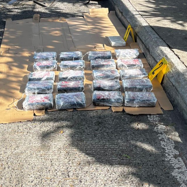 Dentro del vehículo, el Toyota Corolla rojo con placas P-288JRM, encontraron droga escondida en un cajón de una bocina, y un paquete adicional en el asiento trasero. El agente canino K-9 Aman, especializado en detección de narcóticos, localizó la sustancia ilícita.