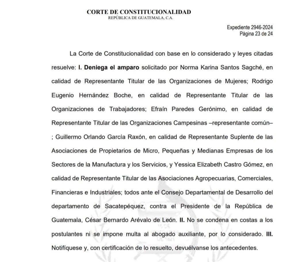 El amparo había sido promovido por los representantes de sectores no gubernamentales ante el Codede para el período 2024-2025. Siendo ellos Rodrigo Hernández Boche, del sector de Trabajadores; Guillermo García, de Mipymes; Norma Santos Sagché, de Mujeres; Efraín Paredes, de Campesinos, y Yessica Castro, representante de empresarios.