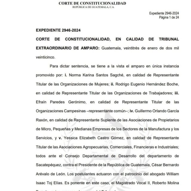 El proceso fue conocido en el Expediente 2946-2024 y en el proceso no se había otorgado el amparo provisional. En tanto, este 23 de enero la CC emitió resolución denegando en definitiva el amparo solicitado, con lo cual queda en firme el nombramiento de la gobernadora Angelina Aspuac.