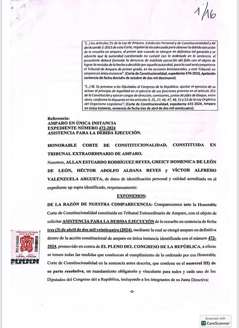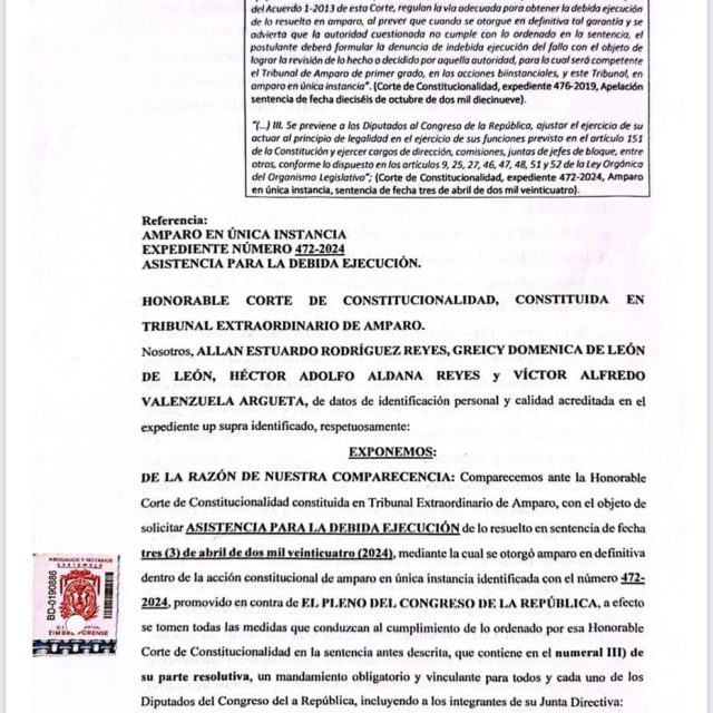 En su parte medular el documento pide “ASISTENCIA PARA LA DEBIDA EJECUCIÓN de lo resuelto en sentencia de fecha tres (3) de abril de dos mil veinticuatro (2024), mediante la cual se otorgó amparo en definitiva dentro de la acción constitucional de amparo en única instancia identificada con el número 472-2024, promovido en contra de el, pleno del Congreso de la República, a efecto se tomen todas las medidas que conduzcan al cumplimiento de lo ordenado por esa Honorable Corte de Constitucionalidad en la sentencia antes descrita, que contiene en el numeral III) de su parte resolutiva, un mandamiento obligatorio y vinculante para todos y cada uno de los Diputados del Congreso de la República, incluyendo a los integrantes de su Junta Directiva” #CongresoDeLaRepublica #metroredes #PartidoVamos