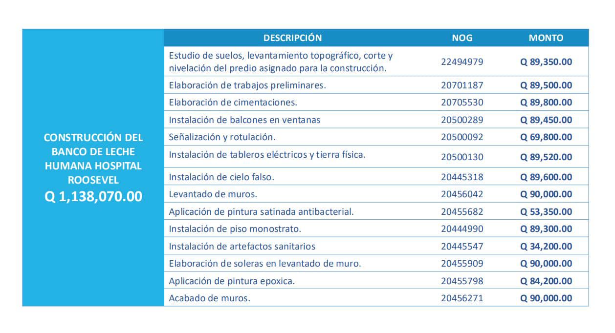 Dicha investigación determinó que se adjudicó un evento para la construcción del banco de leche humana por un monto de un millón 138 mil 70 quetzales.