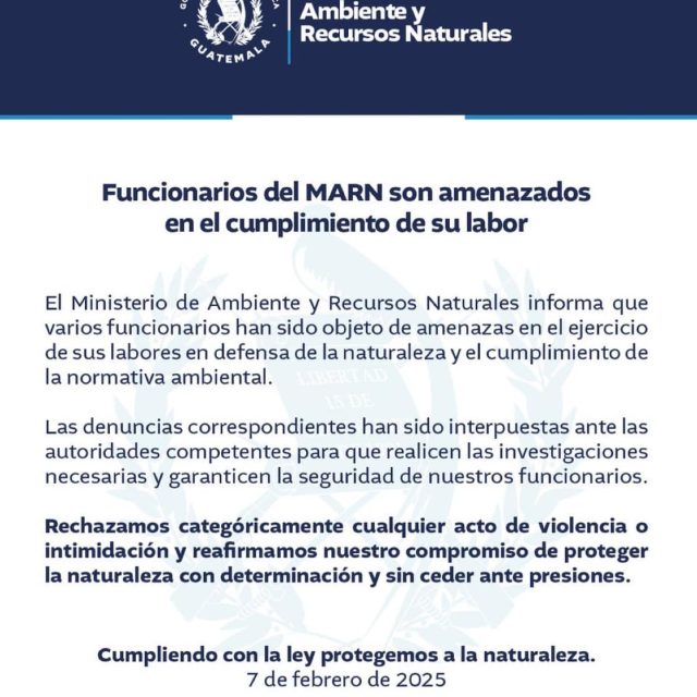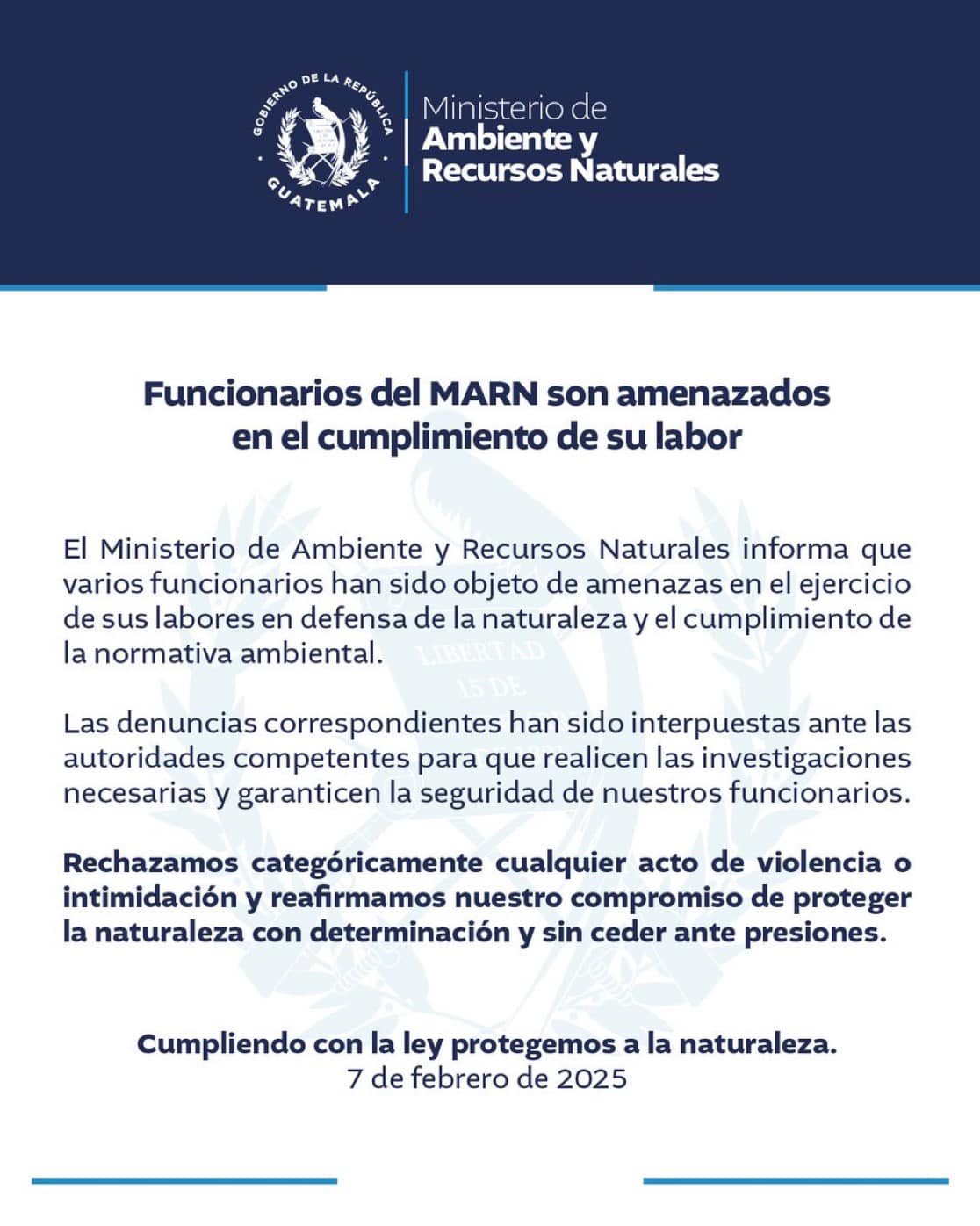 En un comunicado en su página y redes oficiales, el MARN denunció públicamente que colaboradores de esa institución han sido intimidados y amenazados. Esto, en el cumplimiento de la defensa de la naturaleza y las normas y leyes en beneficio del cuidado ambiental.