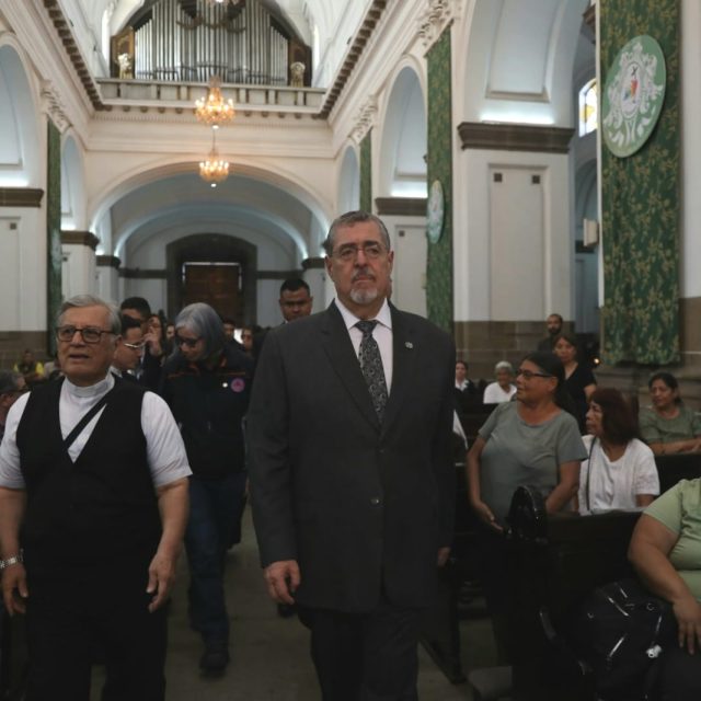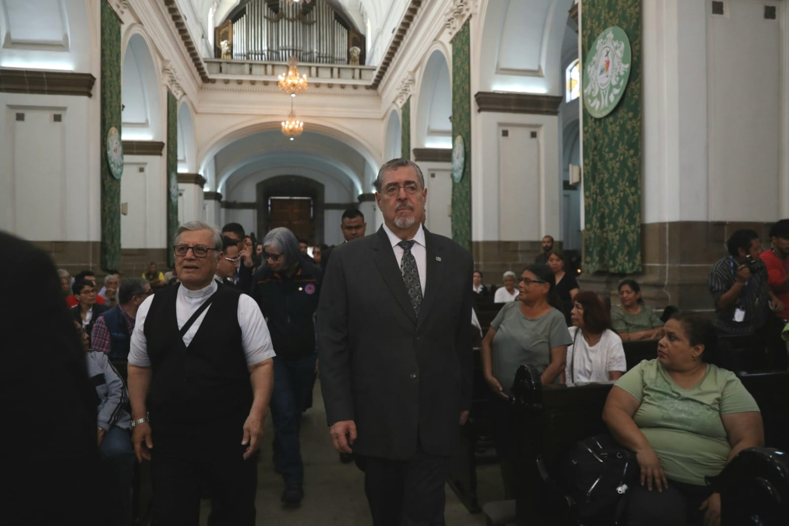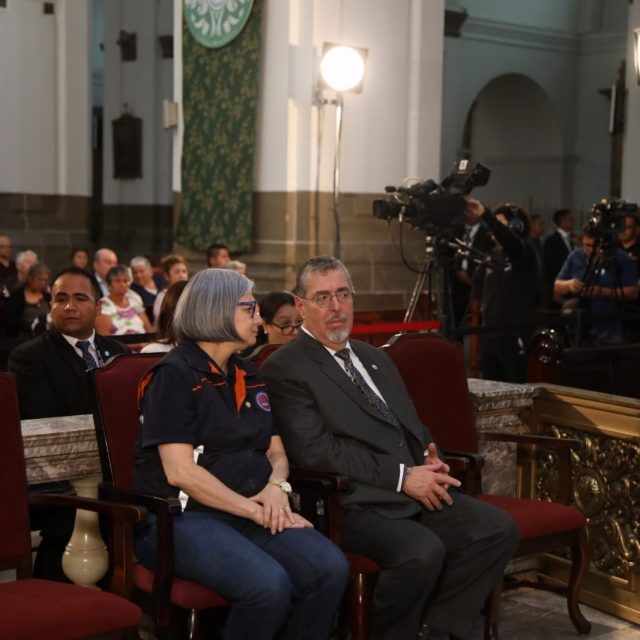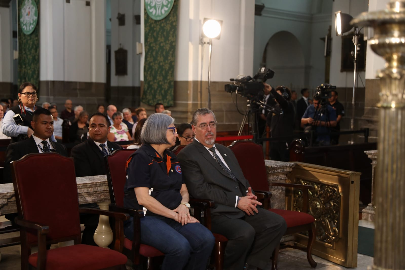 El presidente Bernardo Arévalo, acompañado de la secretaria ejecutiva de la Coordinadora Nacional para la Reducción de Desastres (Conred), Claudinne Ogaldes, asistieron a la misa por las víctimas del accidente de la calzada La Paz.