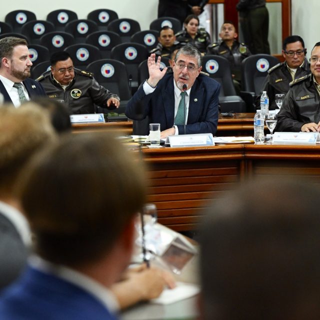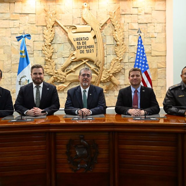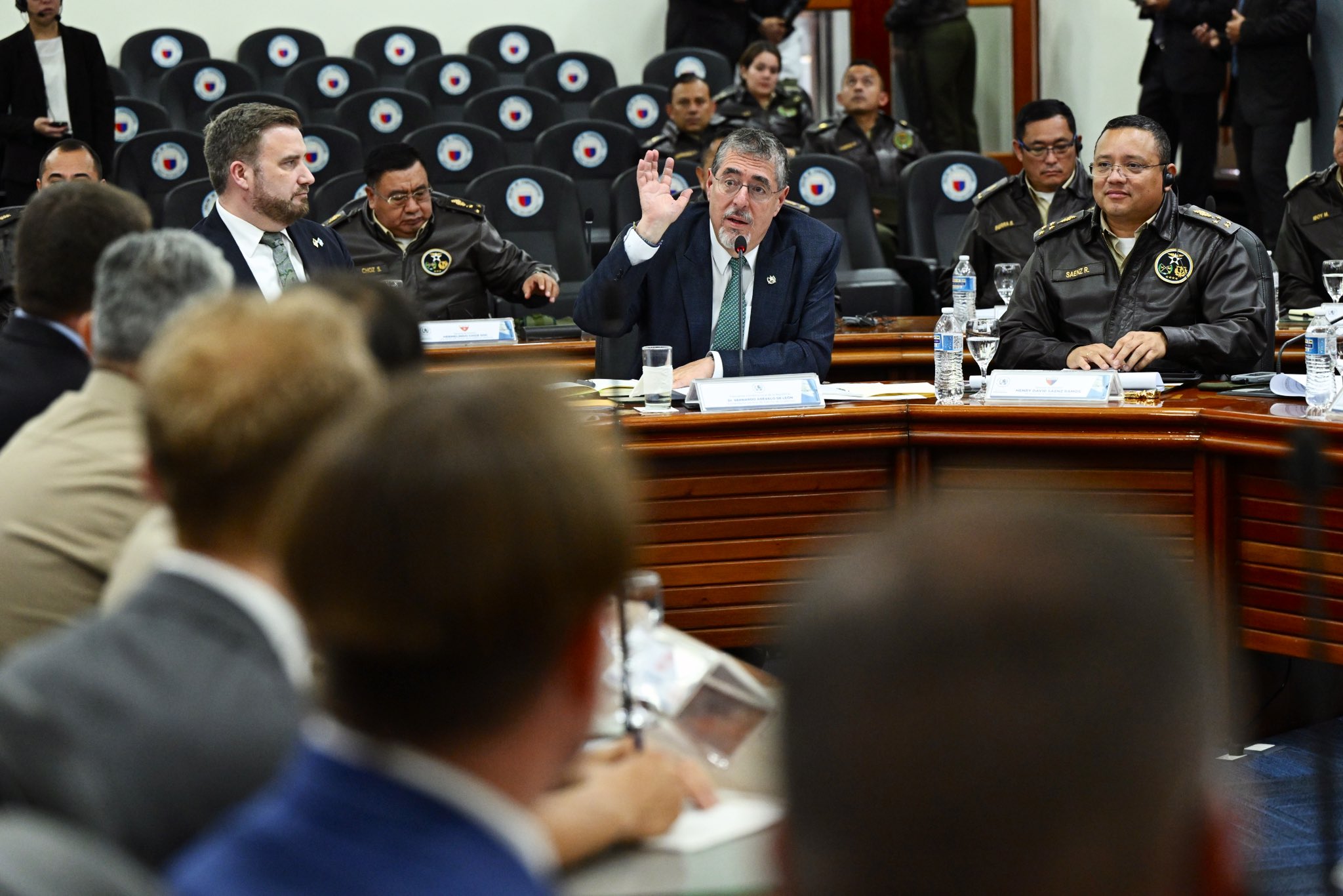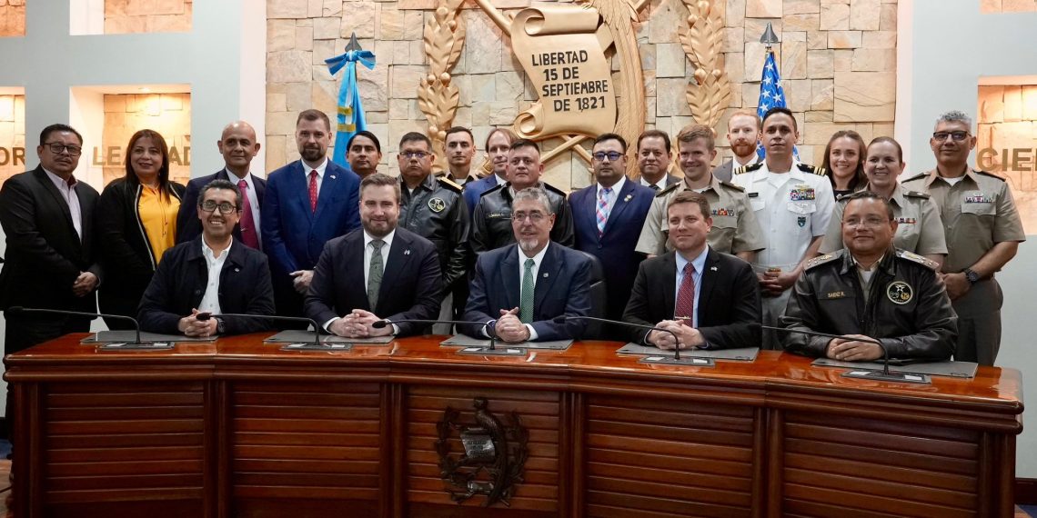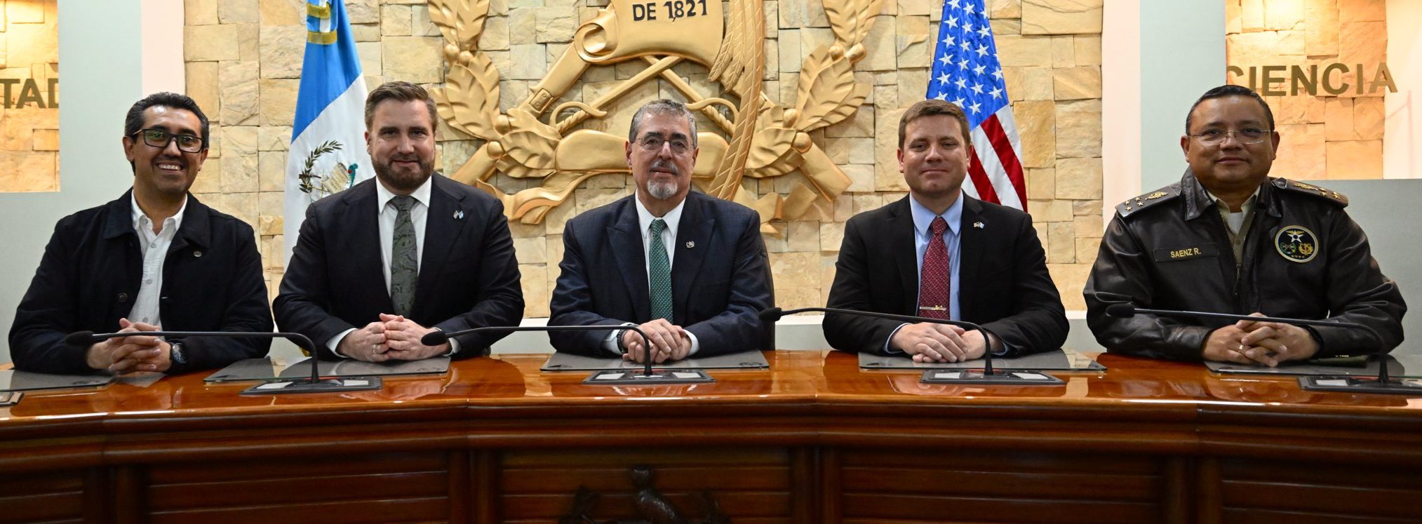 En el Salón Mayor del Ministerio de la Defensa Nacional, el presidente Bernardo Arévalo, acompañado de los ministros de Defensa Nacional y Finanzas Públicas, entre otros funcionarios, se sentó en la mesa junto a la delegación de Estados Unidos, encabezada por el embajador Tobin Bradley, acompañado de los representantes de los expertos estadounidenses que verificaron puerto Quetzal.