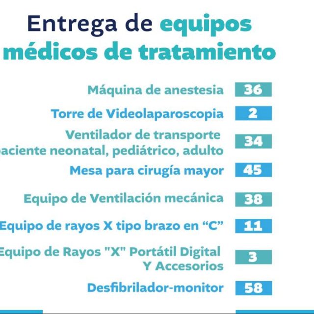 También se distribuyeron 36 máquinas de anestesia, 34 ventiladores de transporte para paciente neonatal, pediátrico y adulto. Además, 11 equipos de rayos X tipo brazo en C, tres equipo de rayos X portátil digital y sus accesorios, y 58 desfibriladores con monitor.