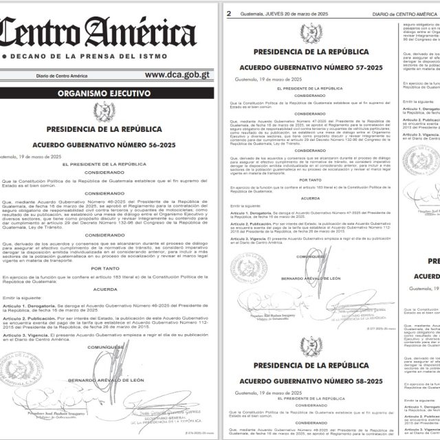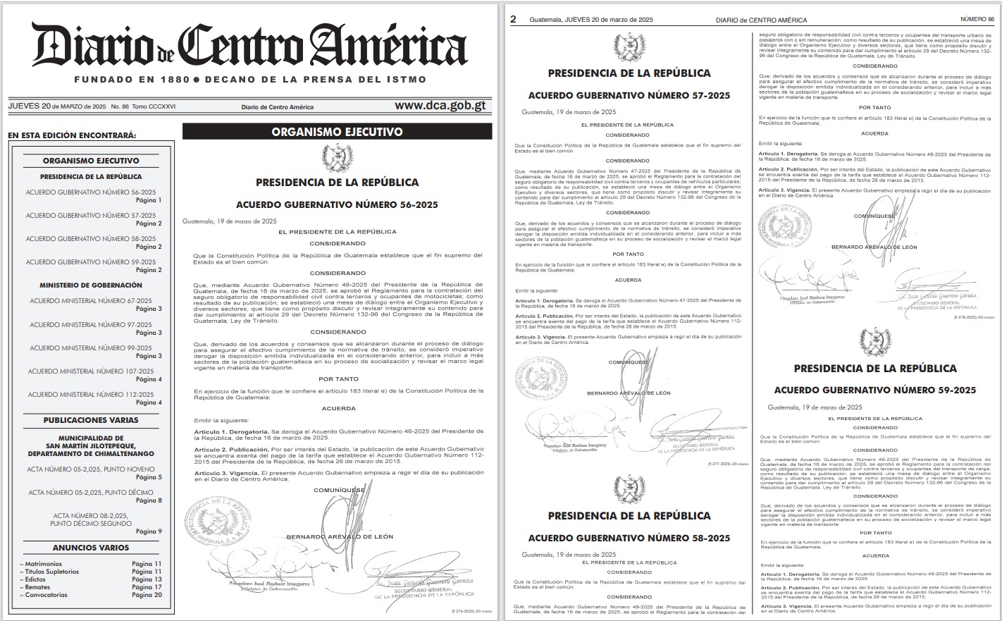 Hoy jueves el gobierno de Guatemala publicó en el Diario de Centro América los acuerdos gubernativos 56-2025, 57-2025, 58-2025 y 59-2025. Dichos acuerdos incluyen la derogatoria de la contratación del seguro obligatorio de responsabilidad civil contra terceros y ocupantes de motocicletas, terceros y ocupantes de vehículos particulares, terceros y ocupantes de transporte de pasajeros y terceros y ocupantes del transporte de carga.