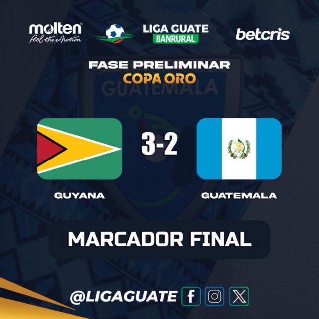 La Bicolor complicó aún más su situación, al perder por 3-2 ante un Guyana que, con un triplete de Isaiah Jones al minuto 9, 36 y 56, se coloca a 90 minutos de eliminar a los chapines de la Copa Oro. José Martínez descontó para Guatemala al minuto 29, mientras que José Carlos Pinto logró el 3-2 al 80 desde el punto penal.