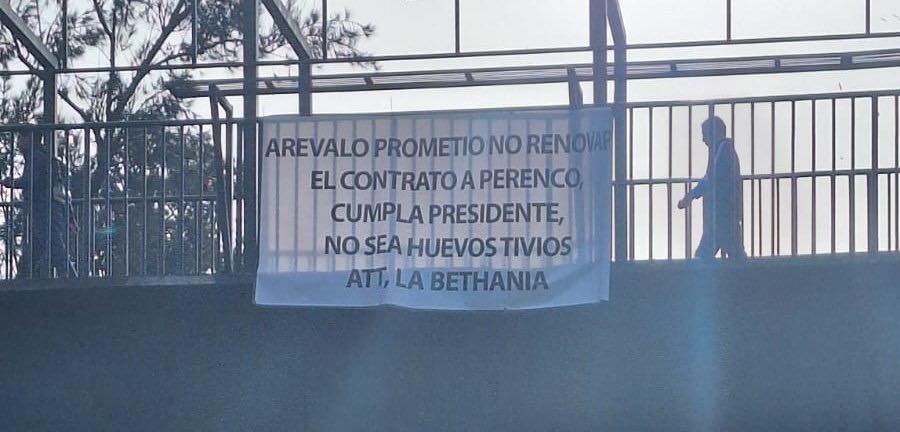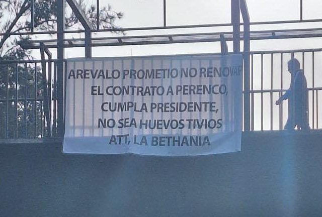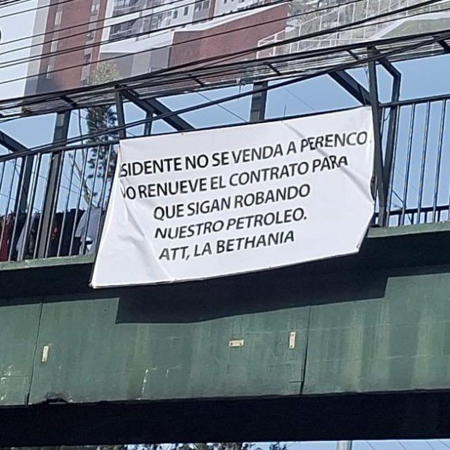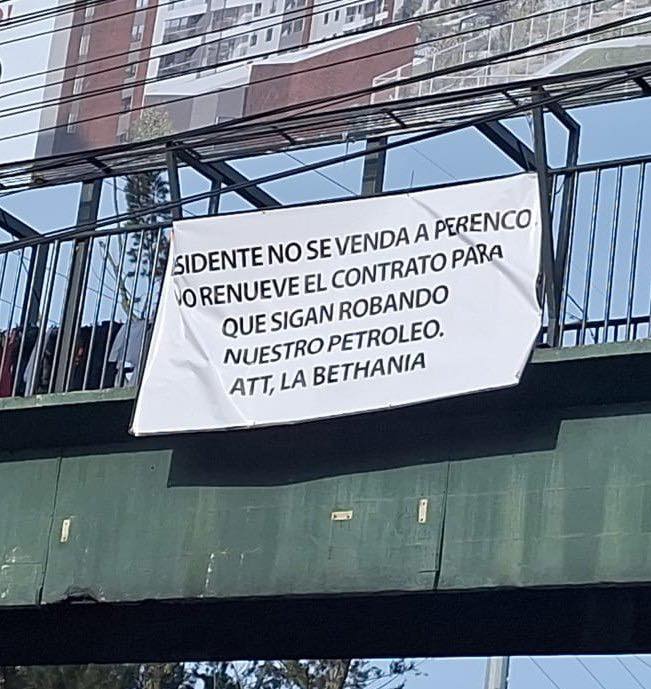 Vecinos de la colonia Bethania exigen al presidente de la República, Bernardo Arévalo por medio de pancartas que no renueve el contrato con la Petrolera Perenco ubicada en Peten, y así evitar que se roben el petróleo del país.