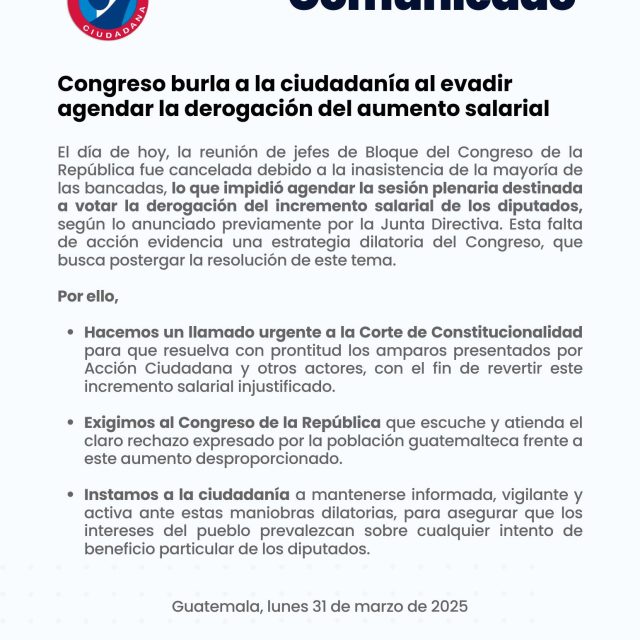 “El día de hoy, la reunión de jefes de Bloque del Congreso de la República fue cancelada debido a la inasistencia de la mayoría de las bancadas, lo que impidió agendar la sesión plenaria destinada a votar la derogación del incremento salarial de los diputados, según lo anunciado previamente por la Junta Directiva” expresa Acción Ciudadana