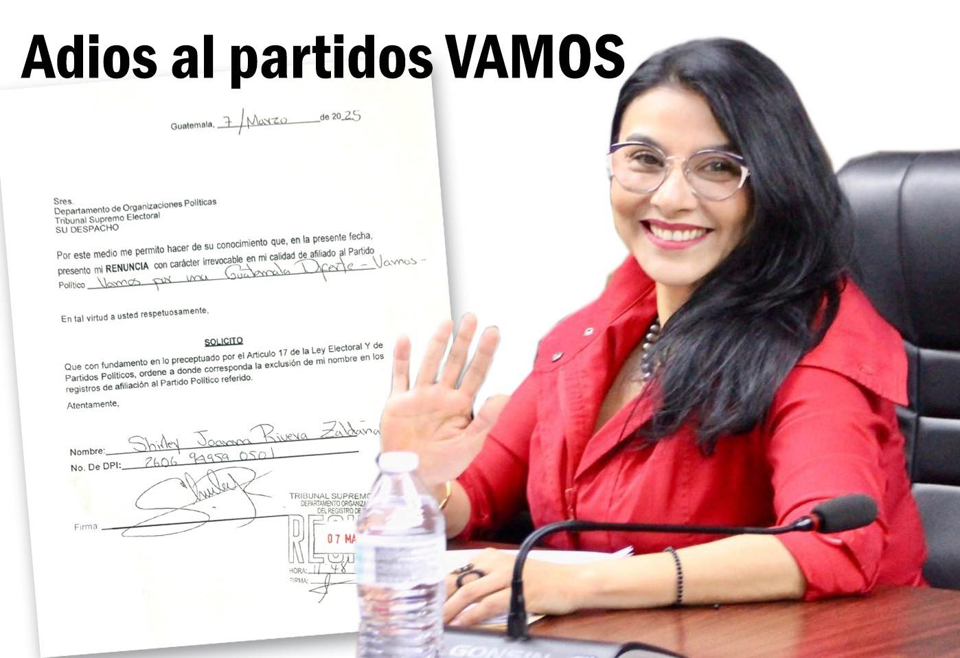 La diputada y ex presidenta del Congreso de la República Shirley Rivera Zaldaña ha renunciado al Partido Político VAMOS según se informo en el Tribunal Supremo Electoral TSE en donde se dan los trámites de ley para que la renuncia surta efecto.