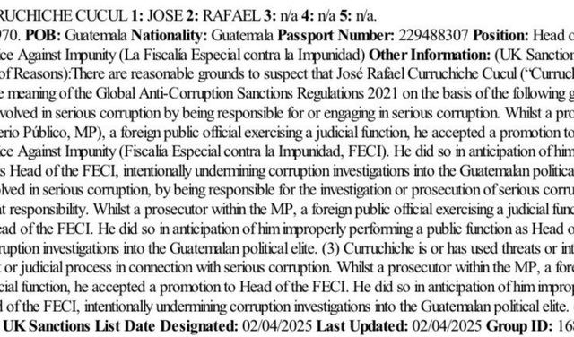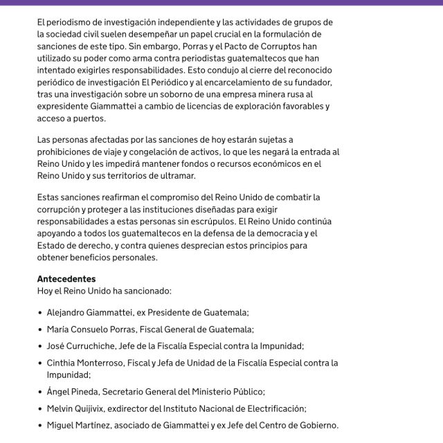 La sanción implica la congelación de fondos y recursos económicos de personas que estén o hayan estado involucradas en actos graves de corrupción y de esa cuenta el gobierno de Inglaterra actualizó la lista de sancionados.