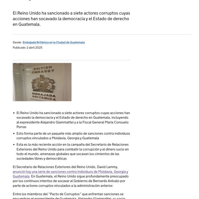 El gobierno de Inglaterra decidió imponer sanciones financieras a personajes guatemaltecos señalados en su lista negra y como parte de las medidas anticorrupción, en este caso, que se vive en Guatemala y los sancionados son, entre ellos, Alejandro Giammattei, Miguel Martínez, Ángel Pineda, Felipe Alejos, Cintia Monterroso, Rafael Curruchiche, Consuelo Porras y Melvin Quijivix.