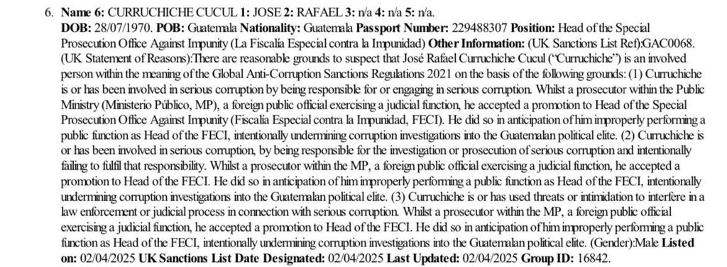 Rafael Curruchiche: jefe de la Fiscalía Especial Contra la Impunidad (FECI) Está o ha estado involucrado en actos graves de corrupción al ser responsable o haber participado en ellos, se lee en el documento del Reino Unido. Se agrega Curruchiche “ha socavando intencionalmente las investigaciones de corrupción en la élite política guatemalteca.