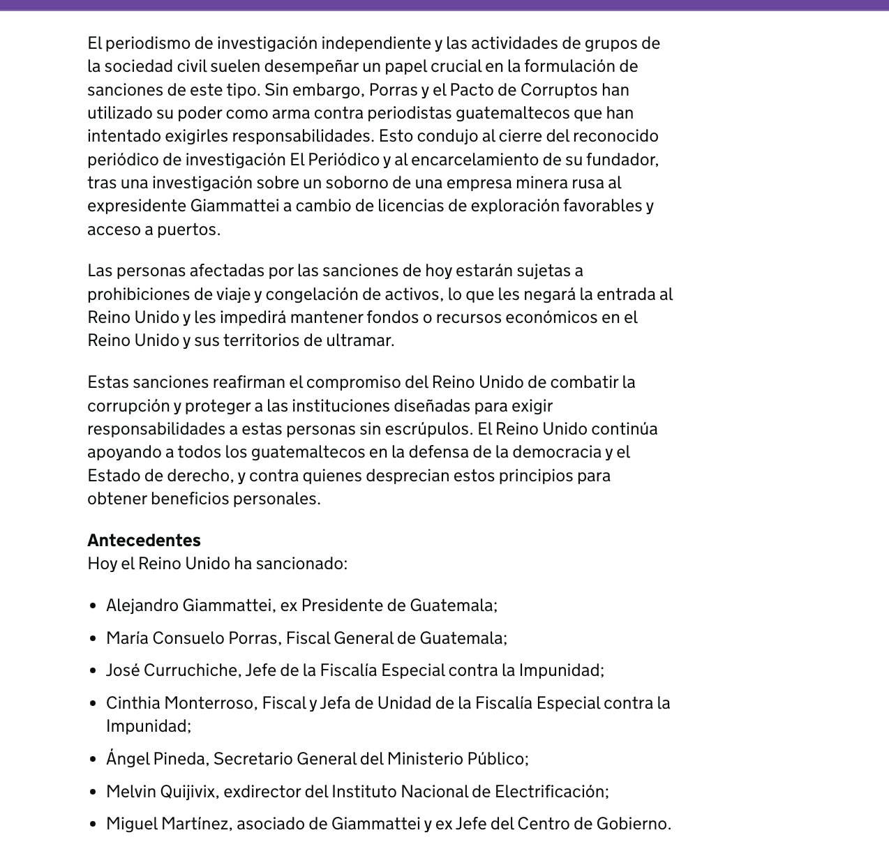 El Reino Unido puntualiza Porras “ha desempeñado indebidamente sus funciones al socavar intencionalmente las investigaciones de corrupción sobre la élite política que la nominó. En particular, socavó las investigaciones sobre la elección y el mandato del presidente Giammattei”.