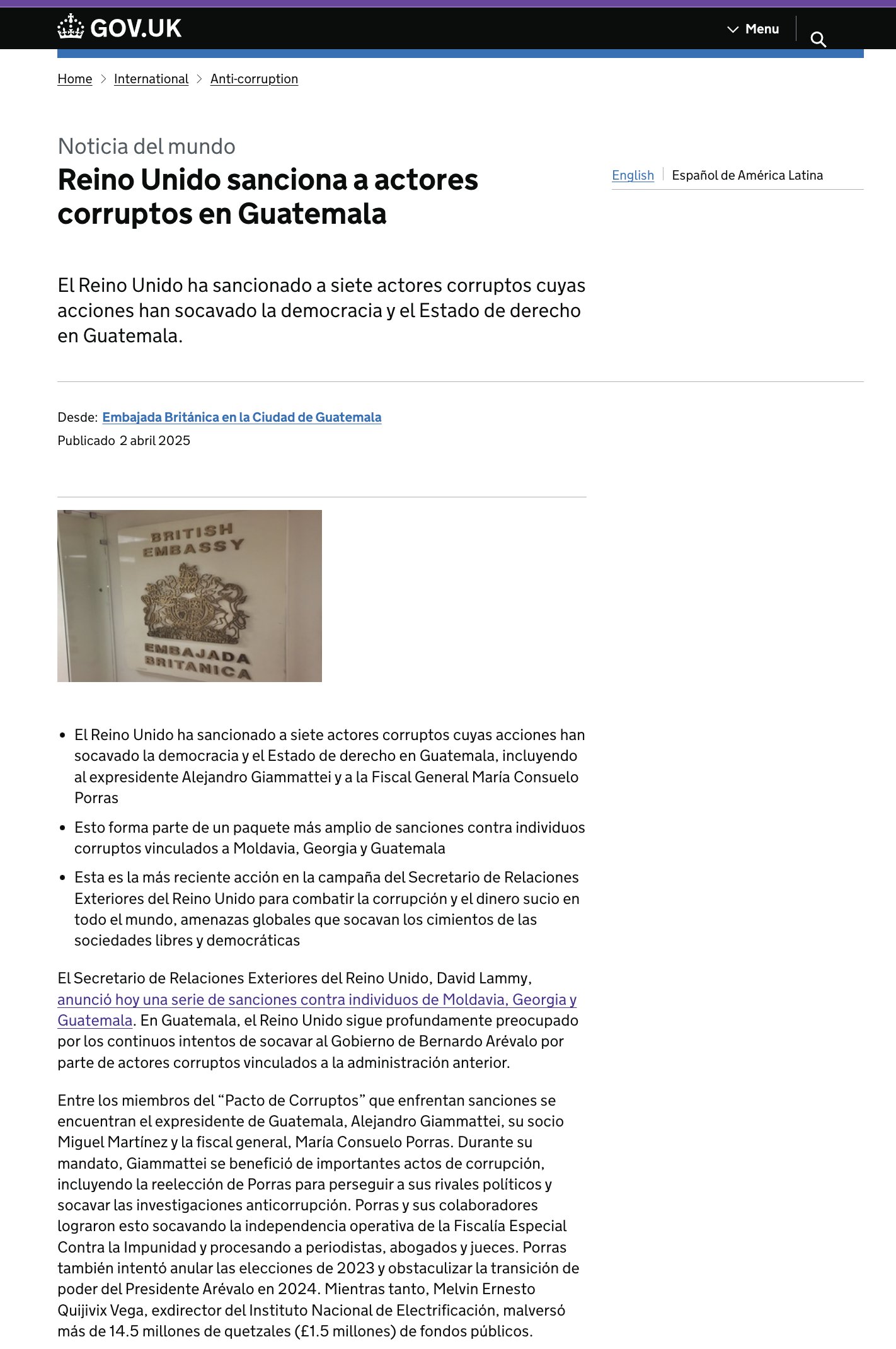 El gobierno de Inglaterra decidió imponer sanciones financieras a personajes guatemaltecos señalados en su lista negra y como parte de las medidas anticorrupción, en este caso, que se vive en Guatemala y los sancionados son, entre ellos, Alejandro Giammattei, Miguel Martínez, Ángel Pineda, Felipe Alejos, Cintia Monterroso, Rafael Curruchiche, Consuelo Porras y Melvin Quijivix.