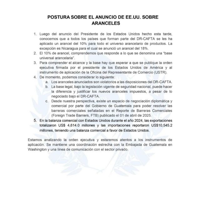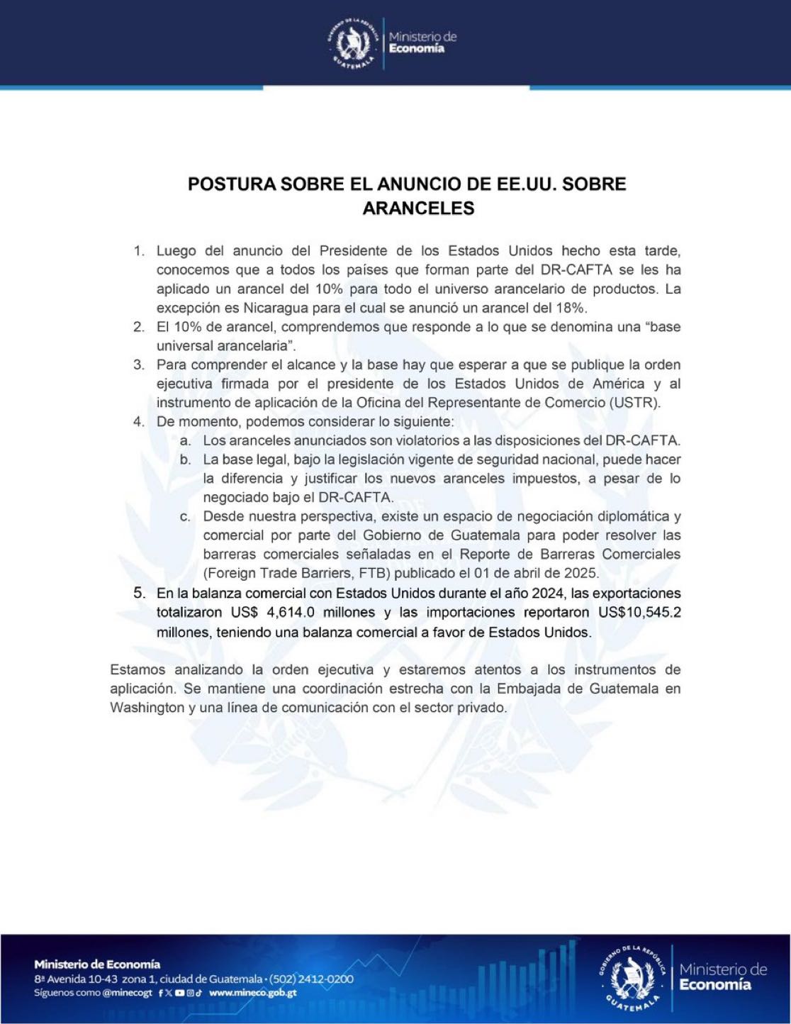 El Ministerio de Economía (Mineco) se pronunció luego de que el Gobierno de los Estados Unidos anunciara la imposición de aranceles de forma unilateral a cientos de países, incluyendo a Guatemala. De esa cuenta, destacó que Guatemala buscaría un espacio de negociación diplomática y comercial. Esto, para minimizar los impactos que pueda tener en ambas economías, especialmente la guatemalteca.
