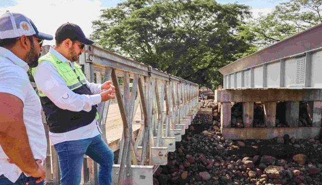 En ese mismo recorrido, también se supervisó la colocación de un puente Bailey sobre el río Platanares, el cual será temporal durante el tiempo que dure al construcción de un puente fijo.