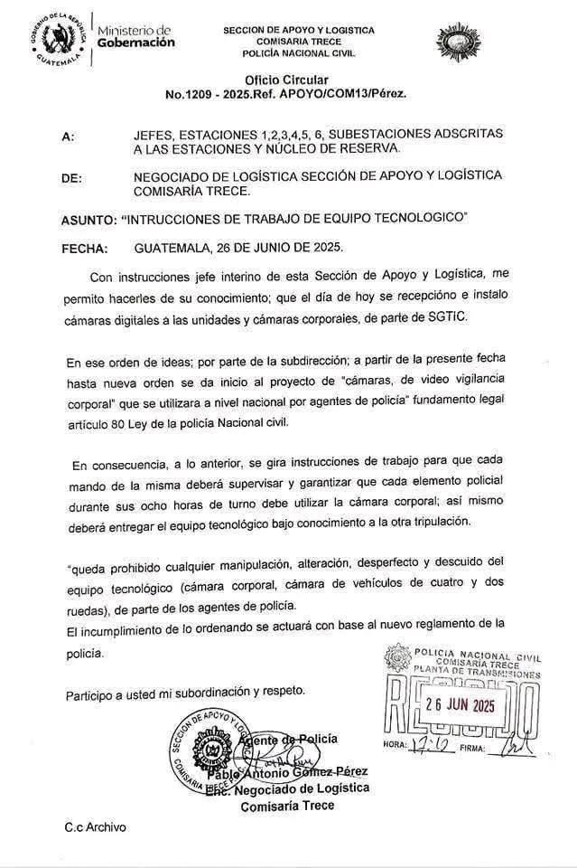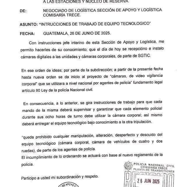 La Comisaría 13 de la Policía Nacional Civil PNC y sus estaciones recibieron este jueves cámaras digitales y cámaras corporales en patrullas y uniformes, como parte del proyecto nacional de videovigilancia policial impulsado por la SGTIC y el Ministerio de Gobernación que dirige Francisco Jiménez