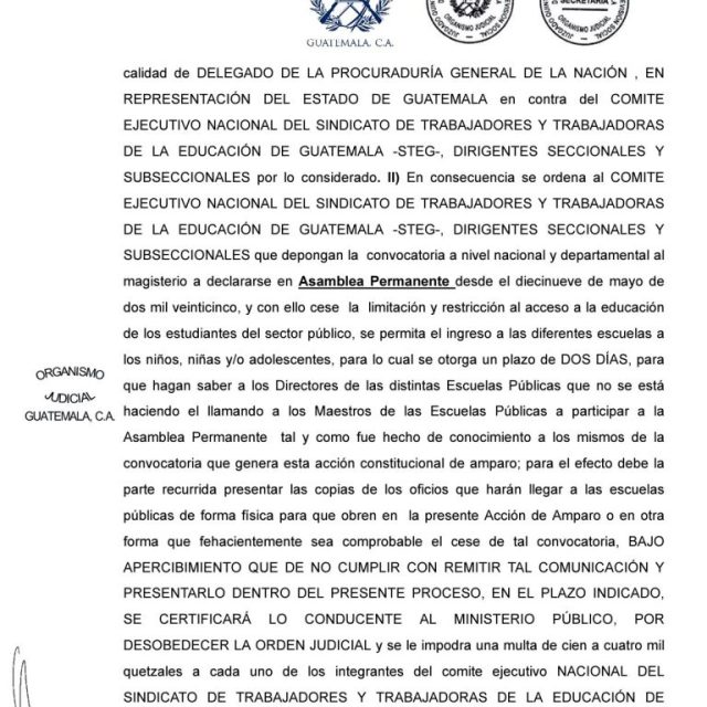 Dentro del comunicado dado a conocer por la organización sindical, reiteran los derechos humanos y constitucionales de libertad de asociación, libertad de acción y libertad de manifestación de cada trabajador y trabajadora del magisterio y que la orden judicial de deponer las medidas de hecho son exclusivas al Comité Ejecutivo Nacional del STEG como dando a conocer que los maestros son libres de continuar con sus medidas.