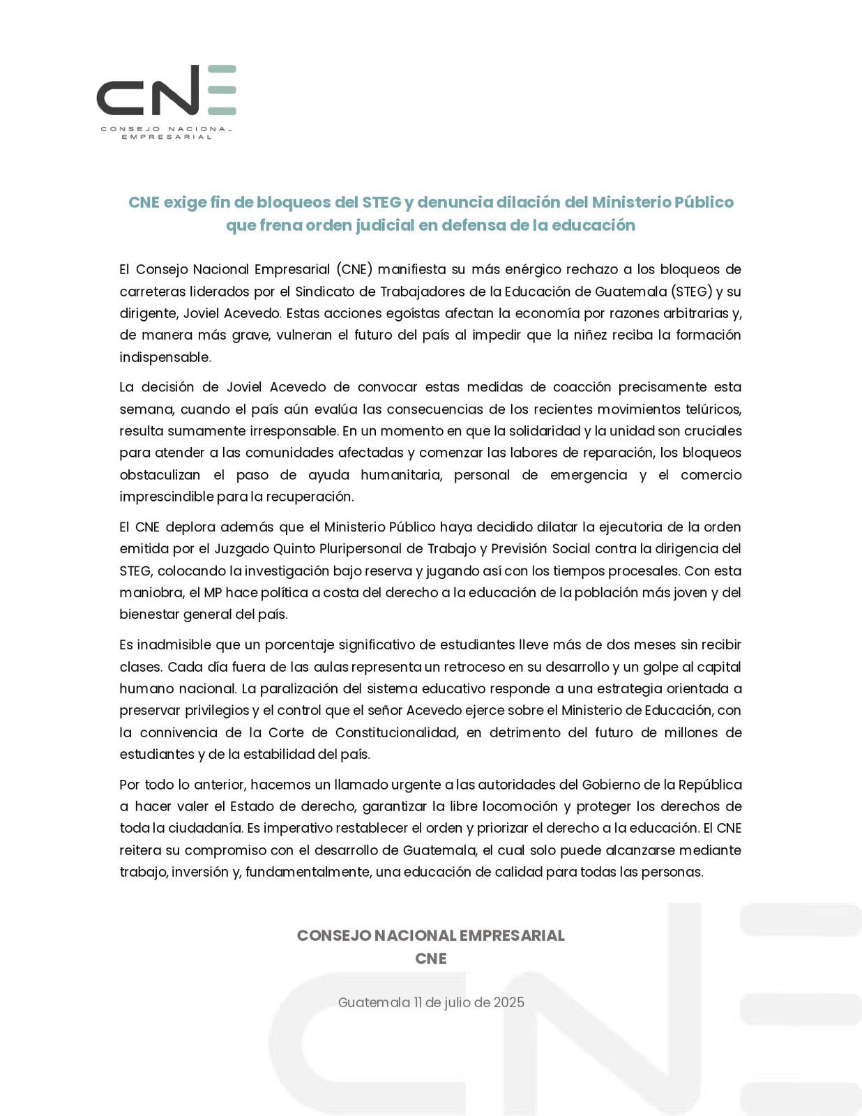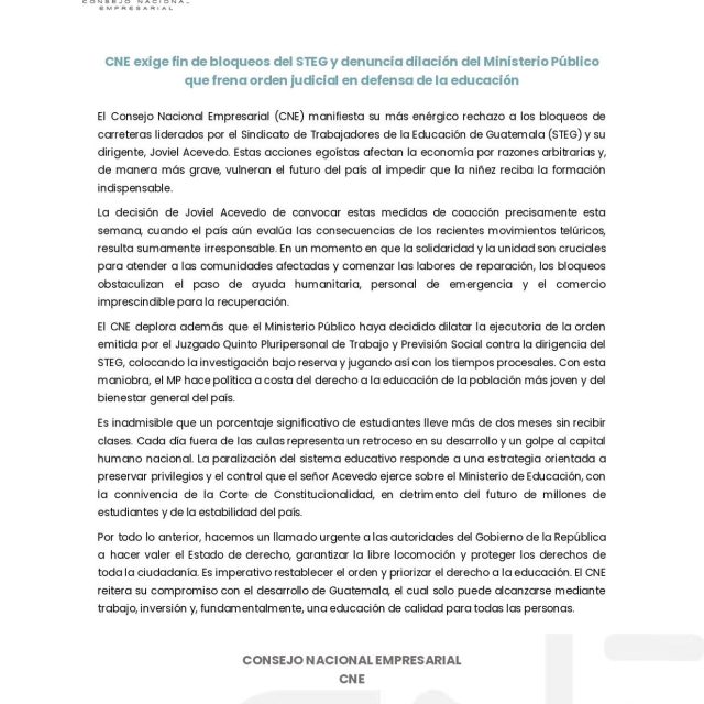 Por su parte el Consejo Nacional de Empresarios emitió un comunicado en el que repudiaron los bloqueos la pasividad del MP en no hacer nada para restablecer el orden y despreocuparse por completo mientras los afectados por los temblores son más afectados por los bloqueos mostrando ser inhumanos y no importarles el dolor de los que murieron, resultaron heridos y los cuantiosos daños en tres departamentos.