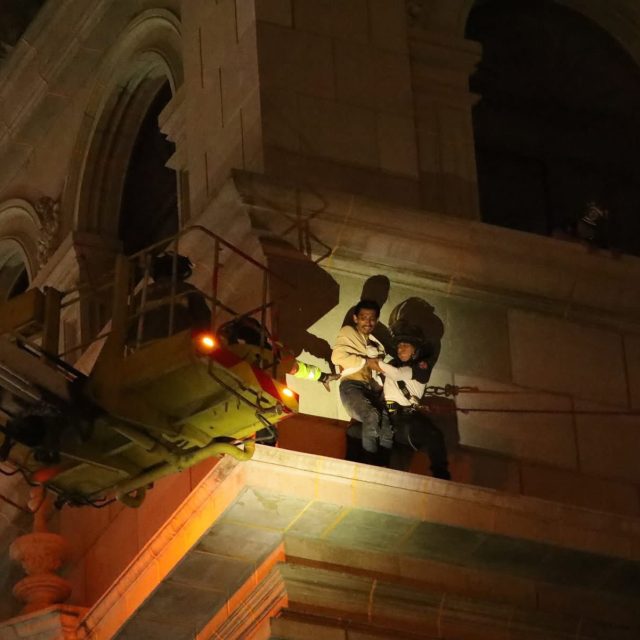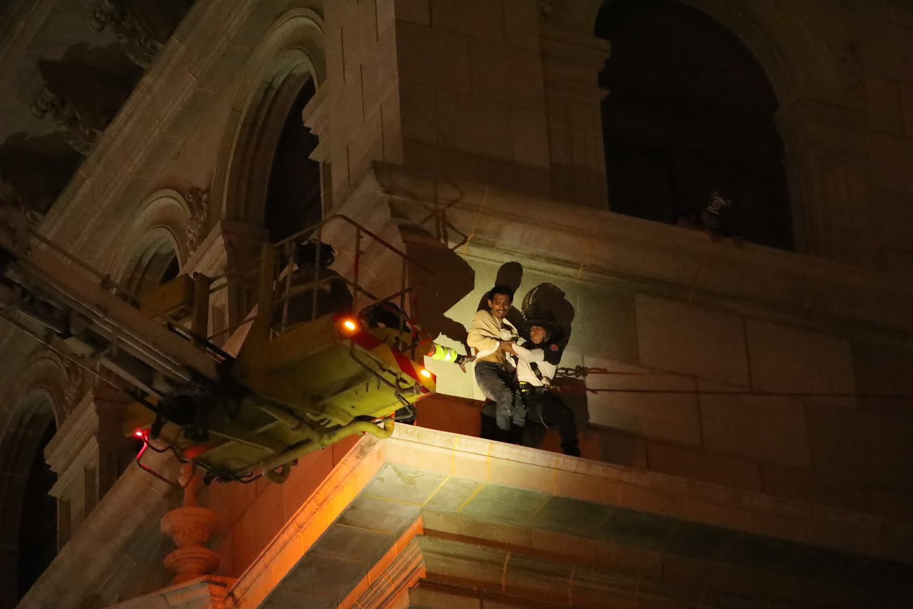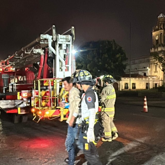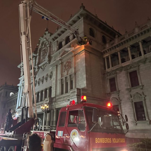 Un hombre que intentó lanzarse de la cornisa del segundo nivel del Palacio Nacional fue auxiliado esta mañana por los bomberos voluntarios. Con técnicas de cuerdas y el uso de la canasta hidráulica, lograron descenderlo de forma segura.