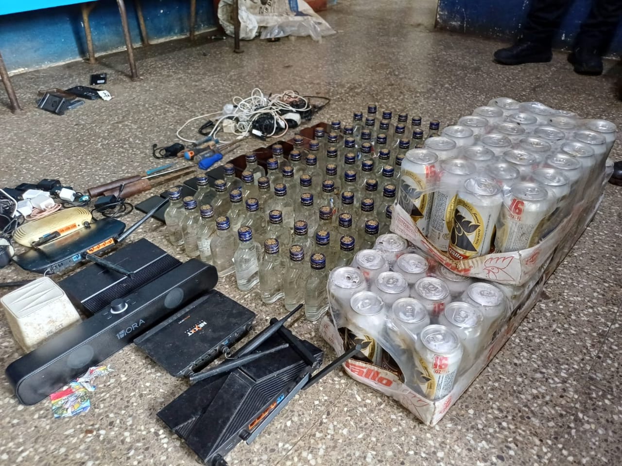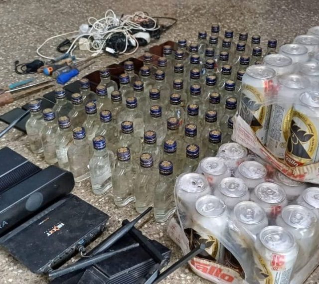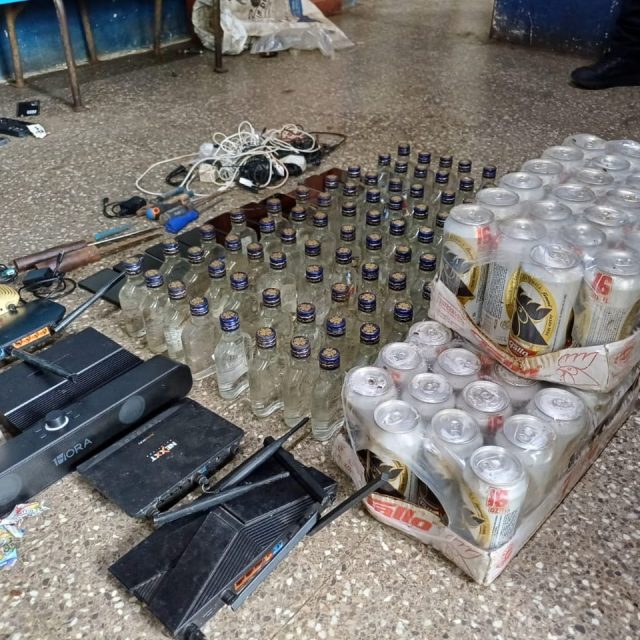 Además, localizaron 80 octavos de licor y 72 latas de cerveza, así como tres cuchillos y tres desarmadores.