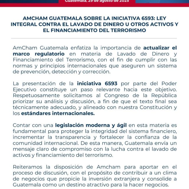 Agrega que “Contar con una legislación moderna y ágil en esta materia es fundamental para proteger la integridad del sistema financiero, incrementar la transparencia y fortalecer la confianza de la comunidad internacional. De esta manera, Guatemala envía un mensaje claro de compromiso con la lucha contra el lavado de activos y financiamiento del terrorismo”.