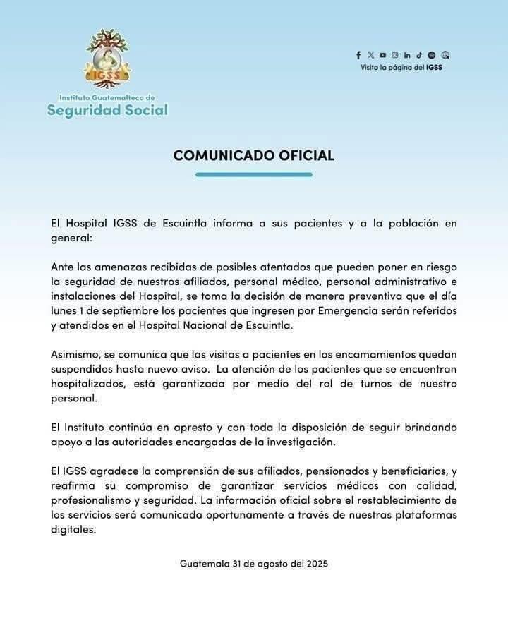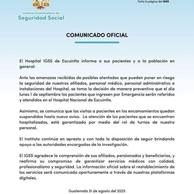 El Instituto de Seguridad Social IGSS de la cabecera departamental de Escuintla informó que por amenazas de posibles atentados, este lunes 1 de septiembre las emergencias serán referidas al Hospital Nacional del Estado y se suspenden las visitas.