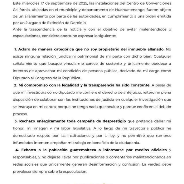 “Mi compromiso con la legalidad y la transparencia ha sido constante. A pesar de que mi investidura como diputado me confiere el derecho de antejuicio, reitero mi plena disposición de colaborar con las instituciones de justicia en cualquier investigación que se instruya en mi contra, porque no tengo nada que ocultar y porque confío en el debido proceso” enfatiza en el comunicado de prensa