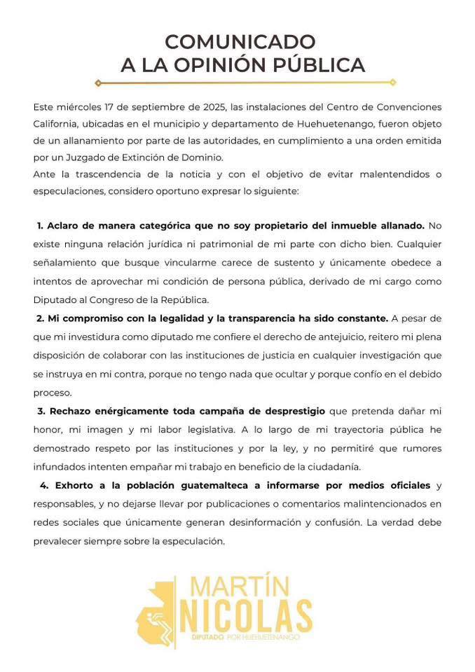 El diputado del Partido Unidad Nacional de la Esperanza UNE Martín Nicolás Segundo del departamento de Huehuetenango negó por medio de un comunicado de prensa que sea el dueño del Centro de Convenciones
