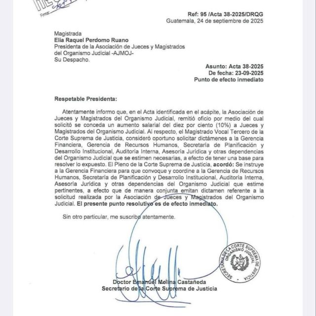 Mientras que jueces favorecen a criminales de alto impacto buscando su comodidad después de graves delitos a la ciudadanía guatemalteca, los magistrados de la Corte Suprema de Justicia buscan aumentarse su salario en un 10% en una solicitud realizada por la Asociación de Jueces y Magistrados del Organismo Judicial, el cual ya fue recibido y se le dio trámite.
