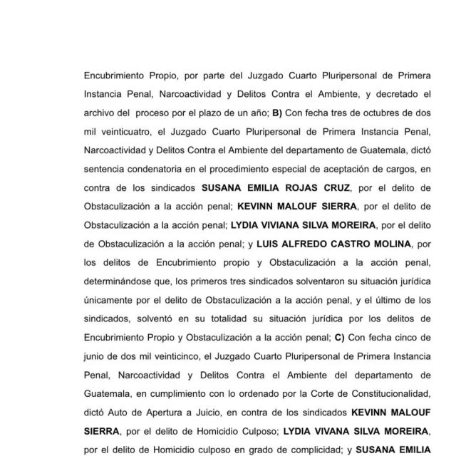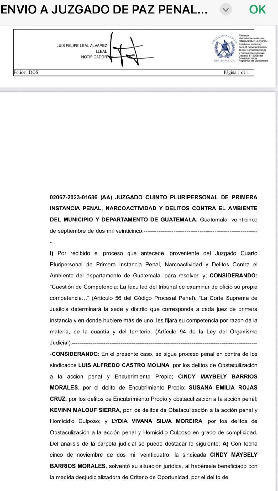 Por aparte los tribunales el doctor Kevin Malouf es beneficiado y descienden su caso a delitos menores, siendo trasladado a un juzgado de paz penal, debido a que el juzgado quinto penal se declaró incompetente para llevar el mismo, beneficiando con delitos mejores a los responsables del asesinato de Floridalma Roque.