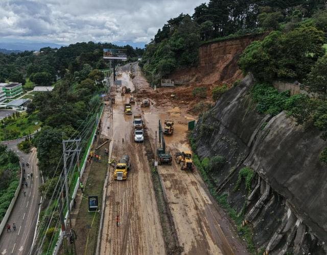 Por tercer día consecutivo, la Unidad Ejecutora de Conservación Vial (Covial) continúa con los trabajos de limpieza y retiro de material en el kilómetro 24 de la ruta CA-1 Oriente, carretera que conduce hacia El Salvador, donde un deslave mantiene el paso vehicular inhabilitado.