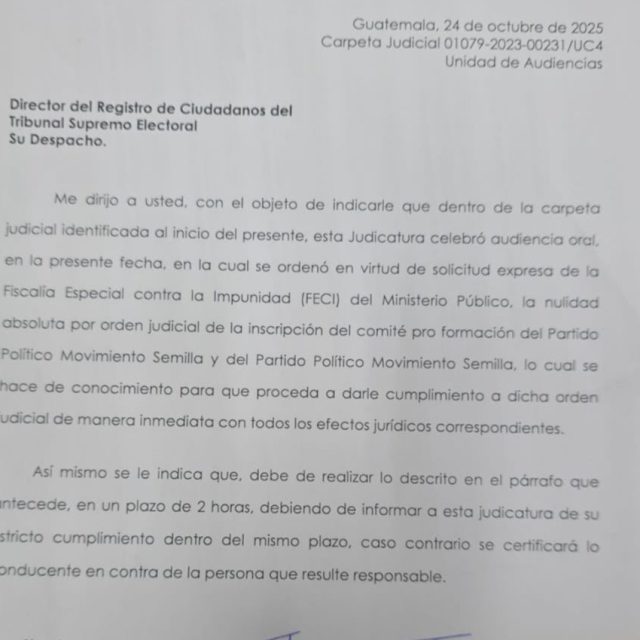 En un documento enviado al Registro de Ciudadanos un documento en el que declara nulidad absoluta al partido Semilla y otorga dos horas a este ente del Tribunal Supremos Electoral para que cumplan con lo que dice la ley de declarar vacantes los puestos de elección que ganó Semilla en el 2026.