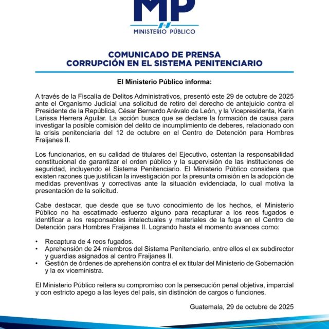 Por el delito de incumplimiento de deberes por la reciente fuga de un grupo de pandilleros de la Mara 18, el Ministerio Público, MP, por medio de la Fiscalía de Delitos Administrativos, presentó hoy ante el Organismo Judicial una solicitud de retiro del derecho de antejuicio contra al presidente Bernardo Arévalo y la vicepresidente Karin Herrera.