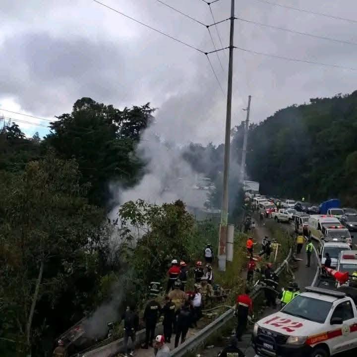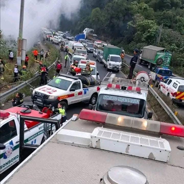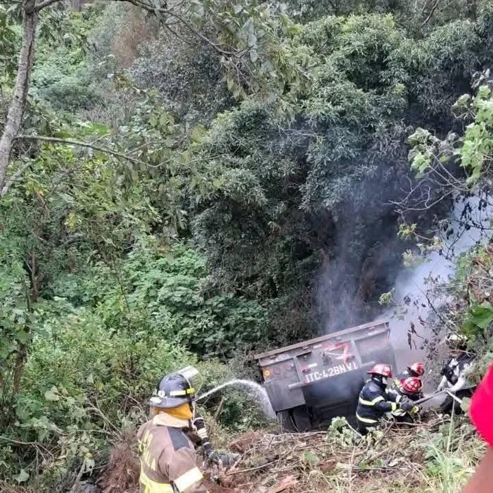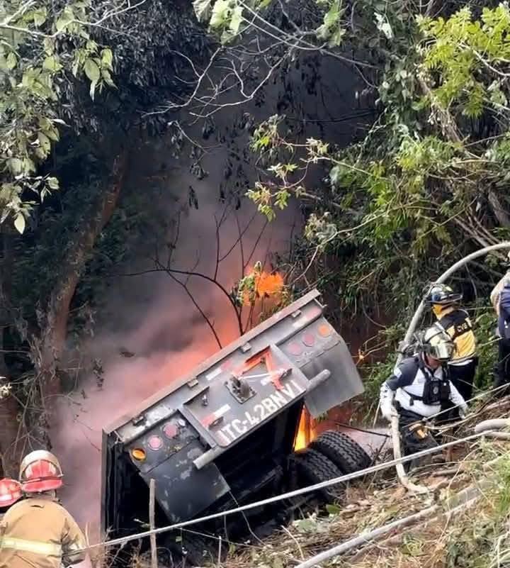 Tráiler se embarrancó y prendió en llamas esta mañana en el km 32 de la ruta Interamericana, jurisdicción de San Bartolomé Milpas Altas.