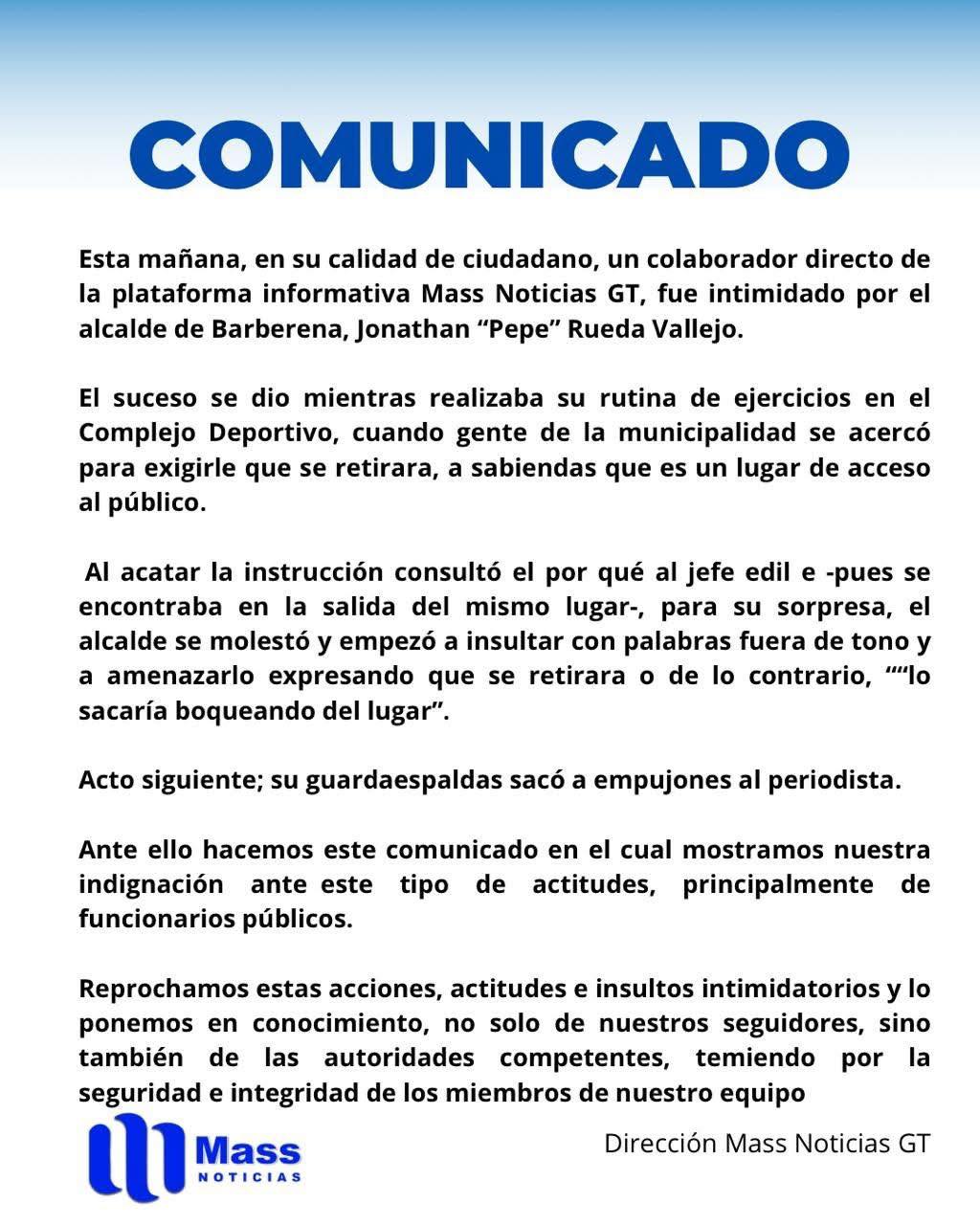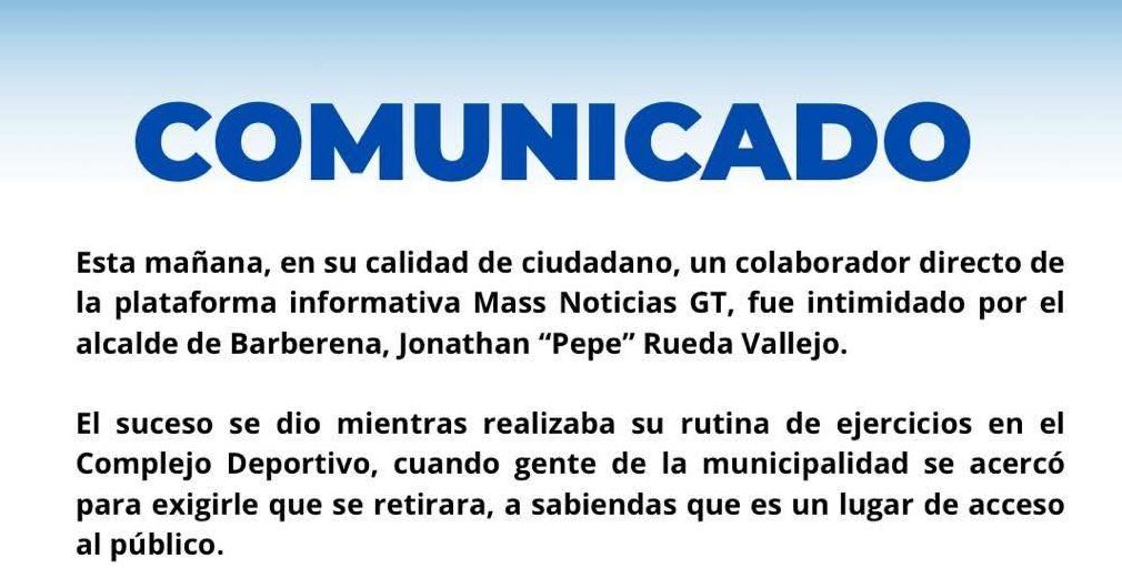 Denuncian intimidación del alcalde Municipal de Barberena Santa Rosa Jonathan “Pepe” Rueda Vallejo a colaborar de la plataforma digital Mass Noticias GT así lo dieron a conocer en un comunicado de prensa
