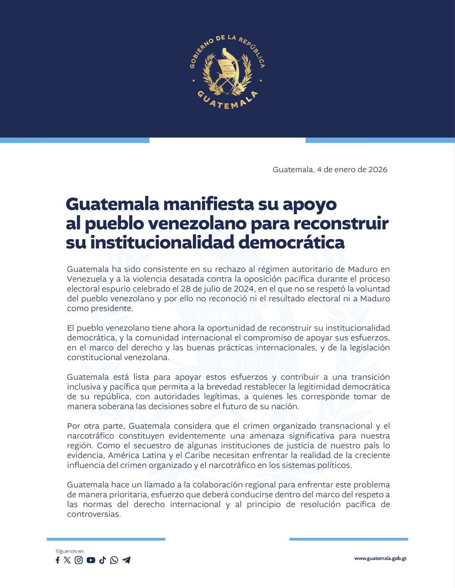 A través de un comunicado oficial el Gobierno de Guatemala manifiesta que “Guatemala ha sido consistente en su rechazo al régimen autoritario de Maduro en Venezuela y a la violencia desatada contra la oposición pacifica durante el proceso electoral espurio celebrado el 28 de julio de 2024, en el que no se respeto la voluntad del pueblo venezolano y por ello no reconoció ni el resultado electoral ni a Maduro como presidente”