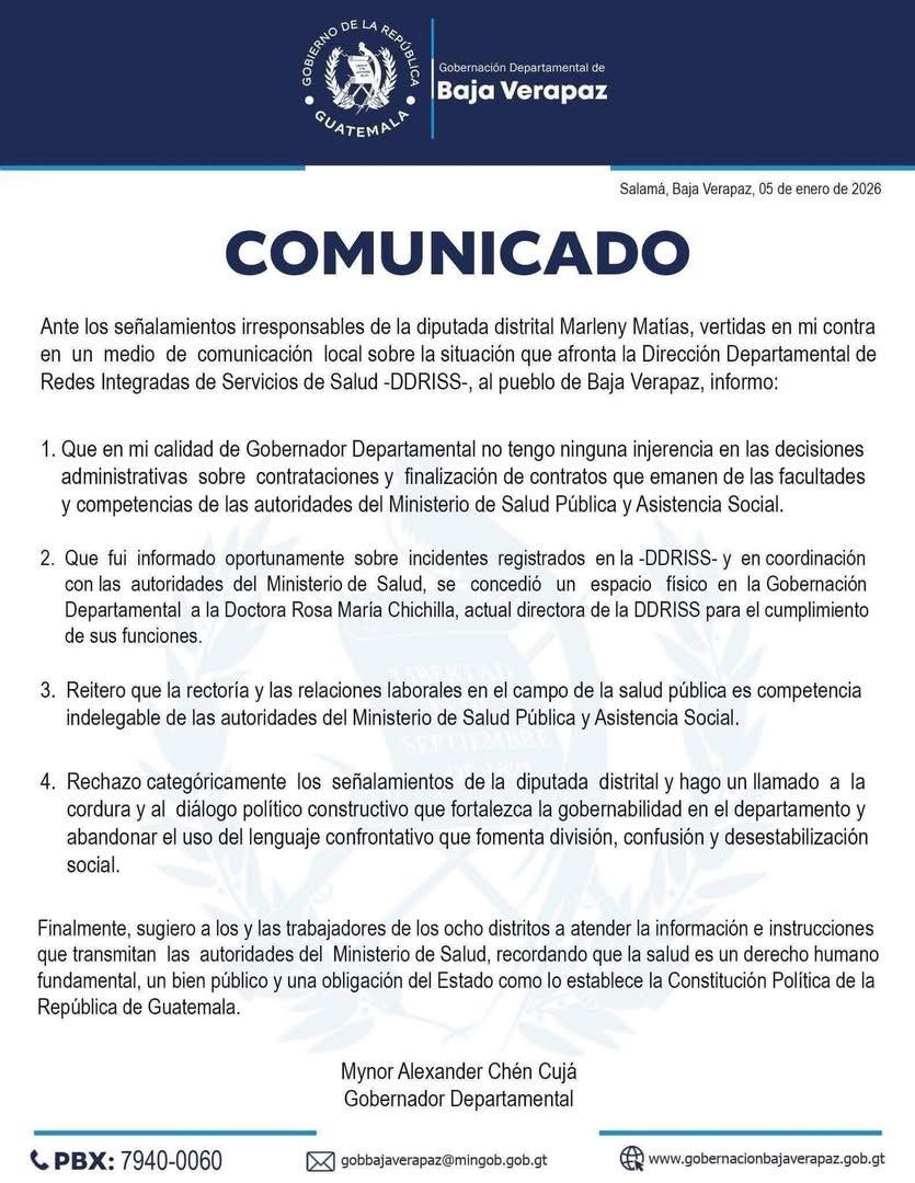 El gobernador departamental Mynor Alexander Chén Cuja rechazó las declaraciones de la diputada de de la UNE Marleny Matías quien a salido a la defensa de trabajadores de salud que no se les renovó el contrato.