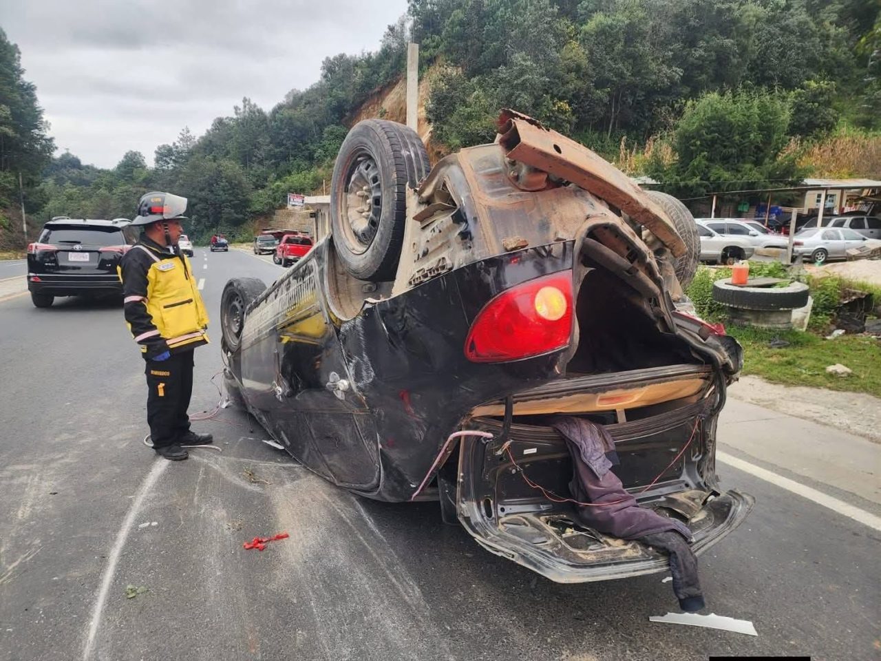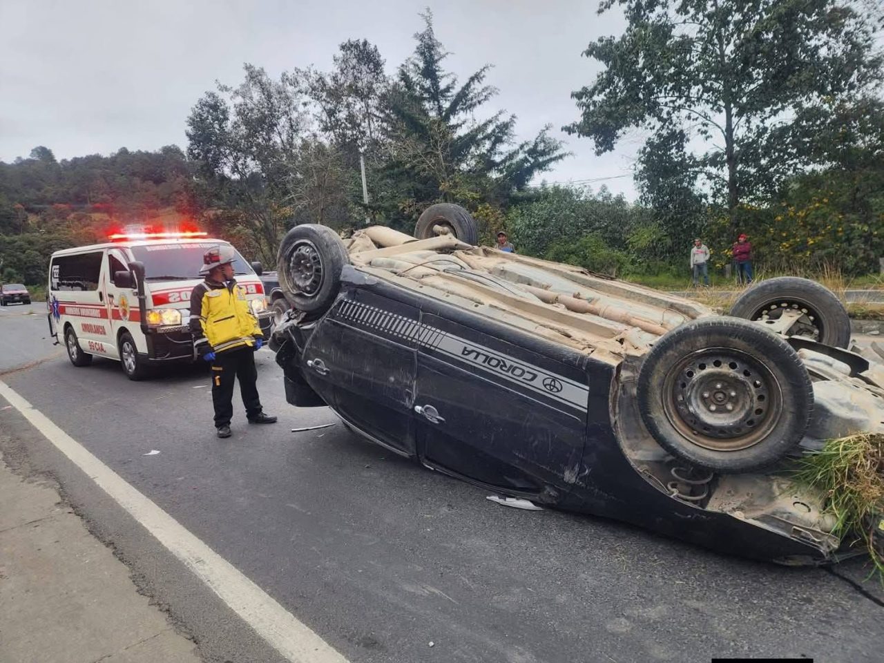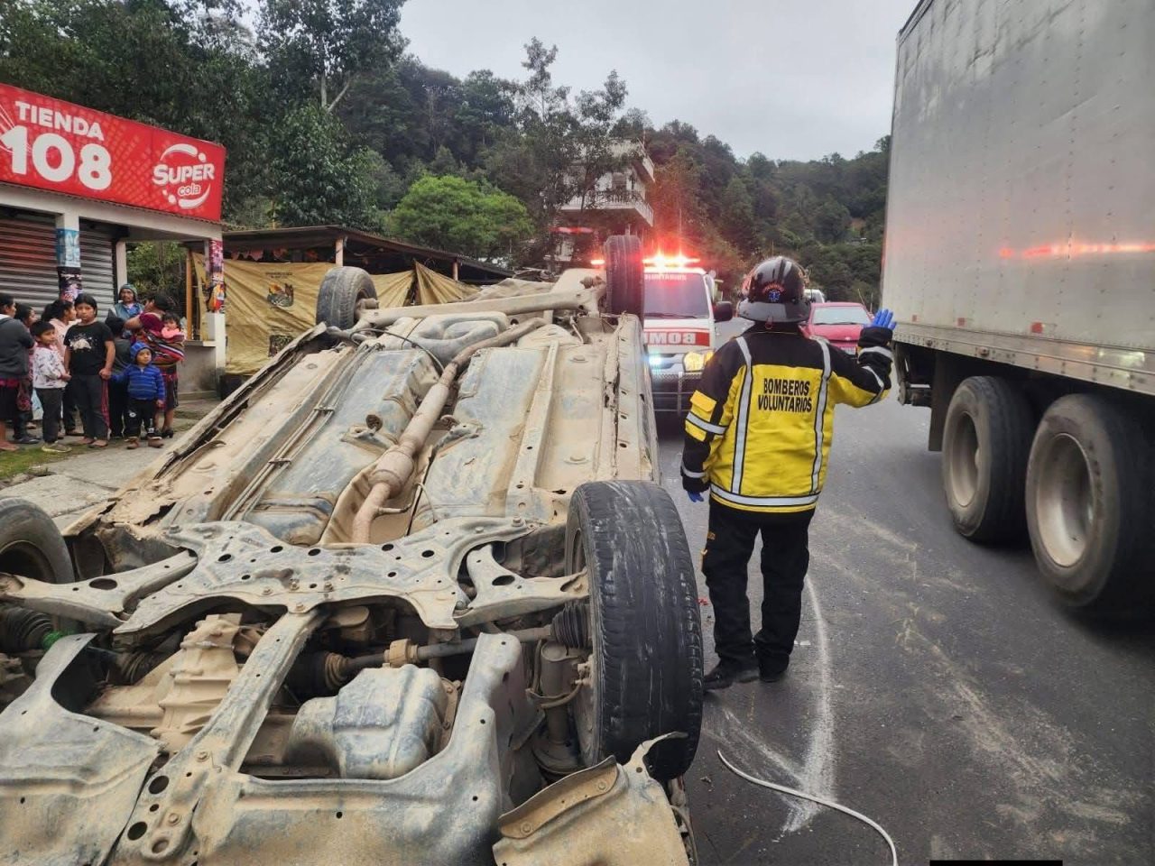 A la altura del kilómetro 107.5 de la ruta Interamericana, jurisdicción del cantón Chupol, Chichicastenango, Quiché, una camioneta tipo sedán volcó sobre la cinta asfáltica.