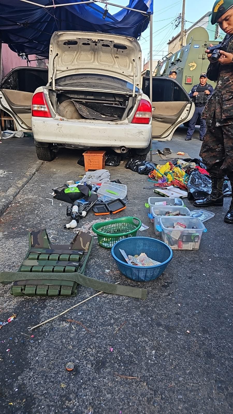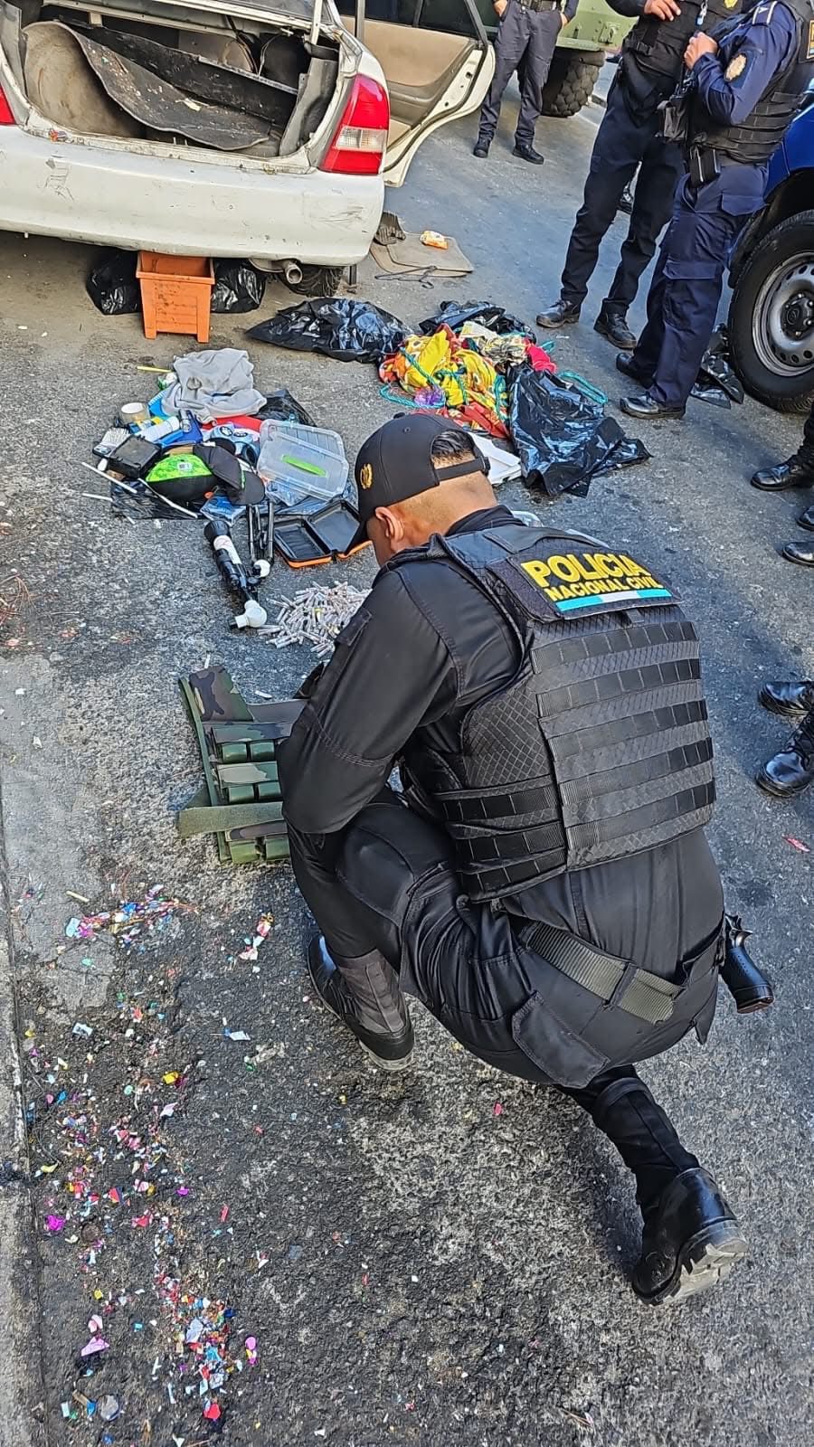 En la 14 calle y 4ª avenida de barrio El Galito, zona 3, agentes de la Policía Nacional Civil PNC de la comisaría 11 y efectivos del Ejército de Guatemala, en un vehículo que se encuentra abandonado se localiza un chaleco, dinero y droga.