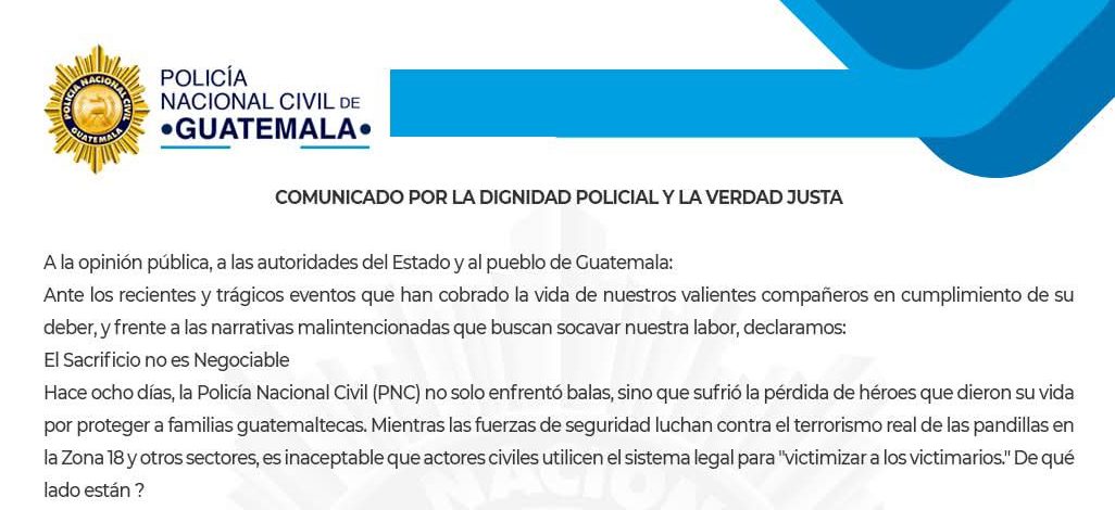 A pesar de la difamación, de los ataques armados y del acoso legal, la PNC seguirá firme. No daremos un paso atrás en la recuperación de los territorios. La sangre de nuestros compañeros fallecidos nos obliga a continuar con más fuerza” agrega el l comunicado de la institución policial.