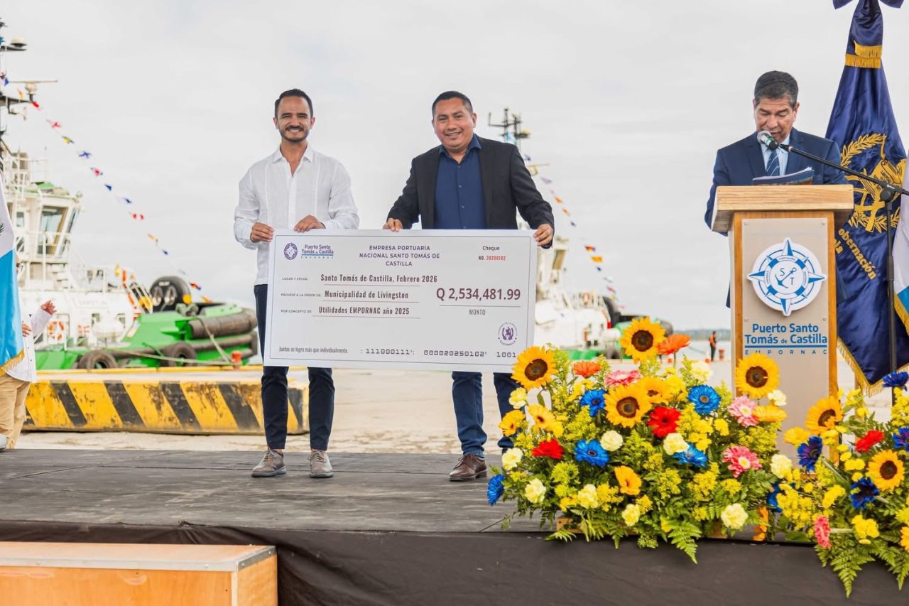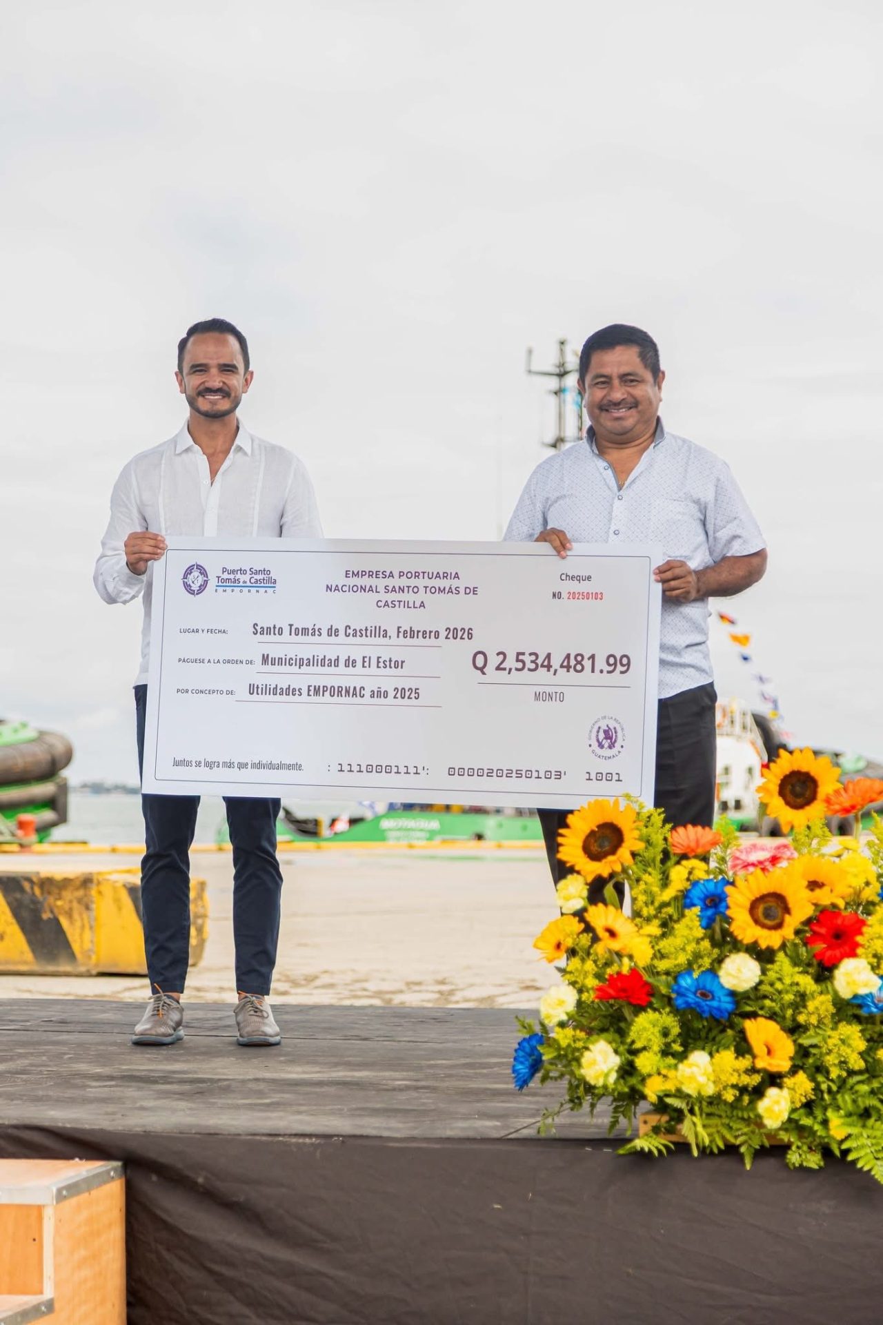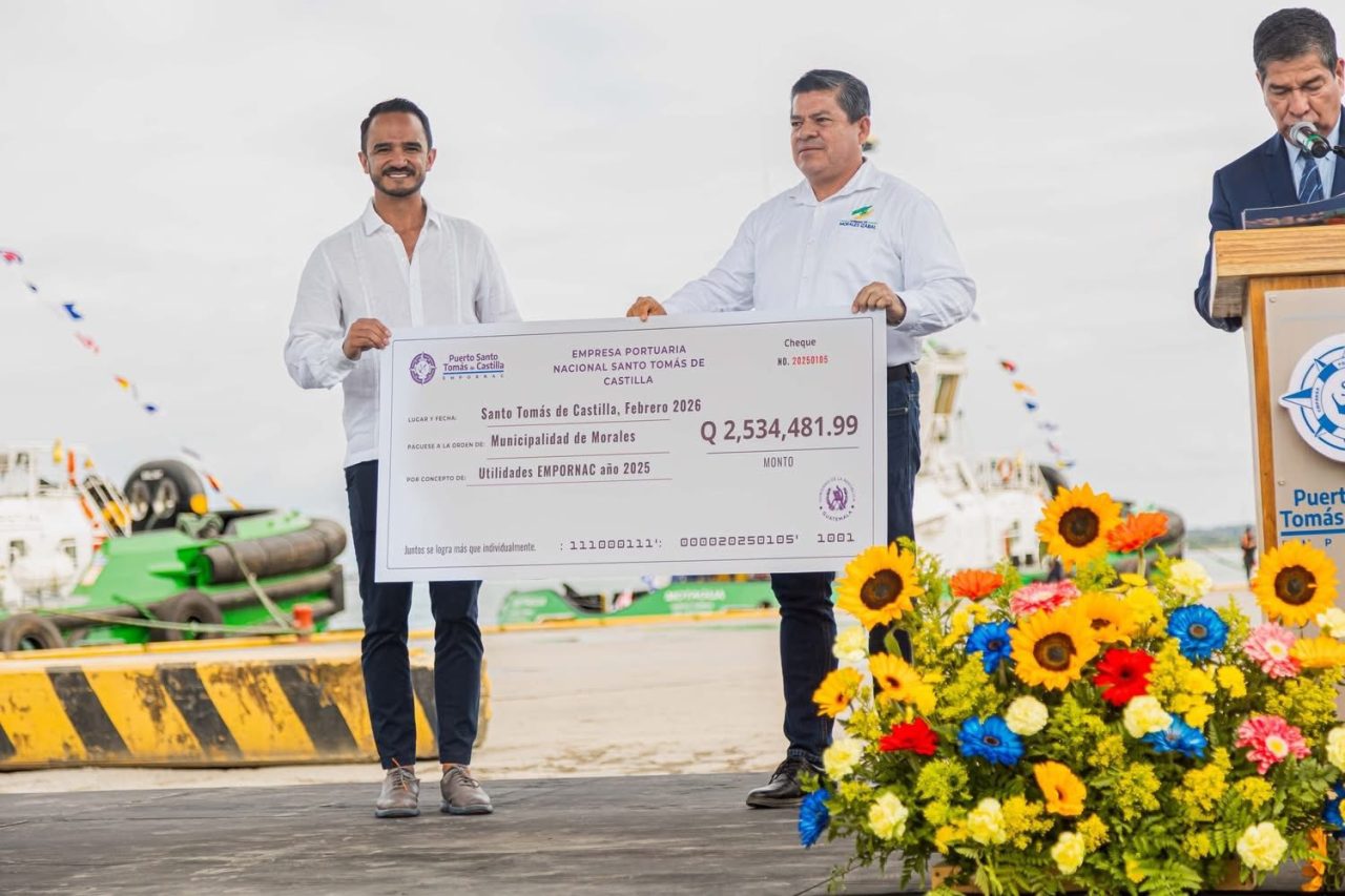 En el marco del acto oficial de Entrega de Utilidades 2025, el Presidente de la Junta Directiva de EMPORNAC, José De La Peña, realizó la entrega y distribución de los dividendos correspondientes al ejercicio fiscal 2025, beneficiando a los trabajadores portuarios, al Estado de Guatemala y a las municipalidades del departamento de Izabal.