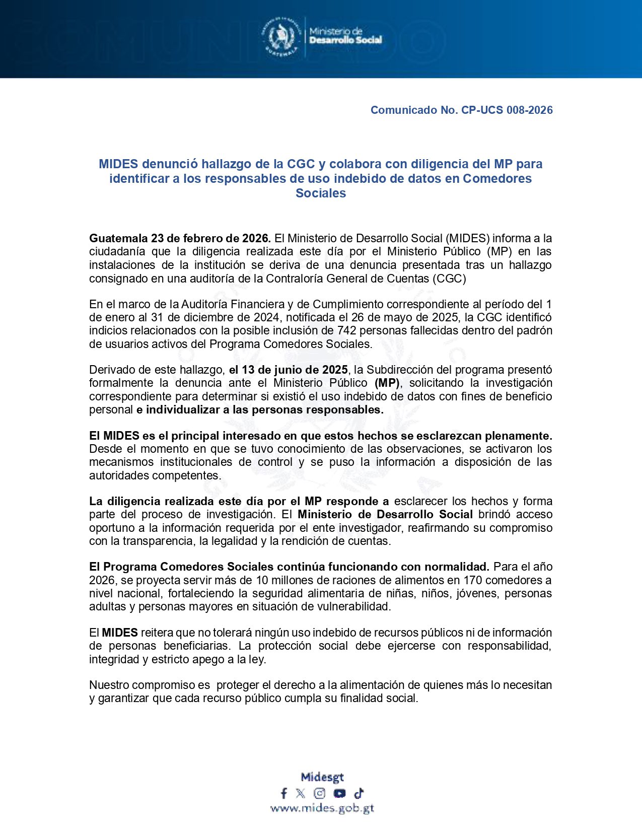 El Ministerio de Desarrollo Social Mides por medio de un comunicado oficial informó que la diligencia realizada este día por el Ministerio Público (MP) en sus instalaciones responde a una denuncia presentada por la propia institución, tras un hallazgo detectado en una auditoría practicada por la Contraloría General de Cuentas CGC