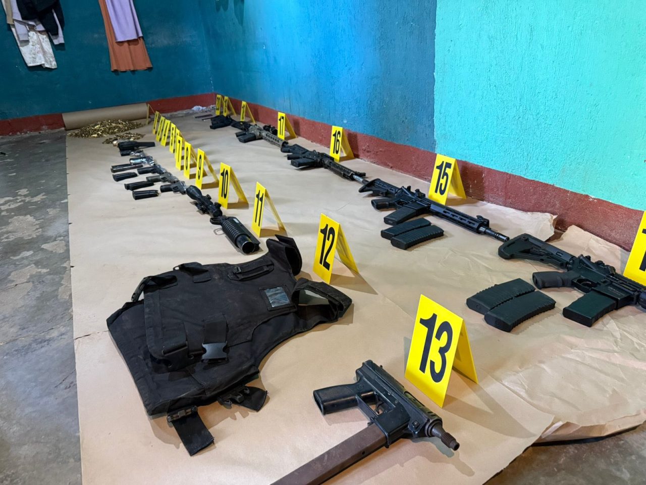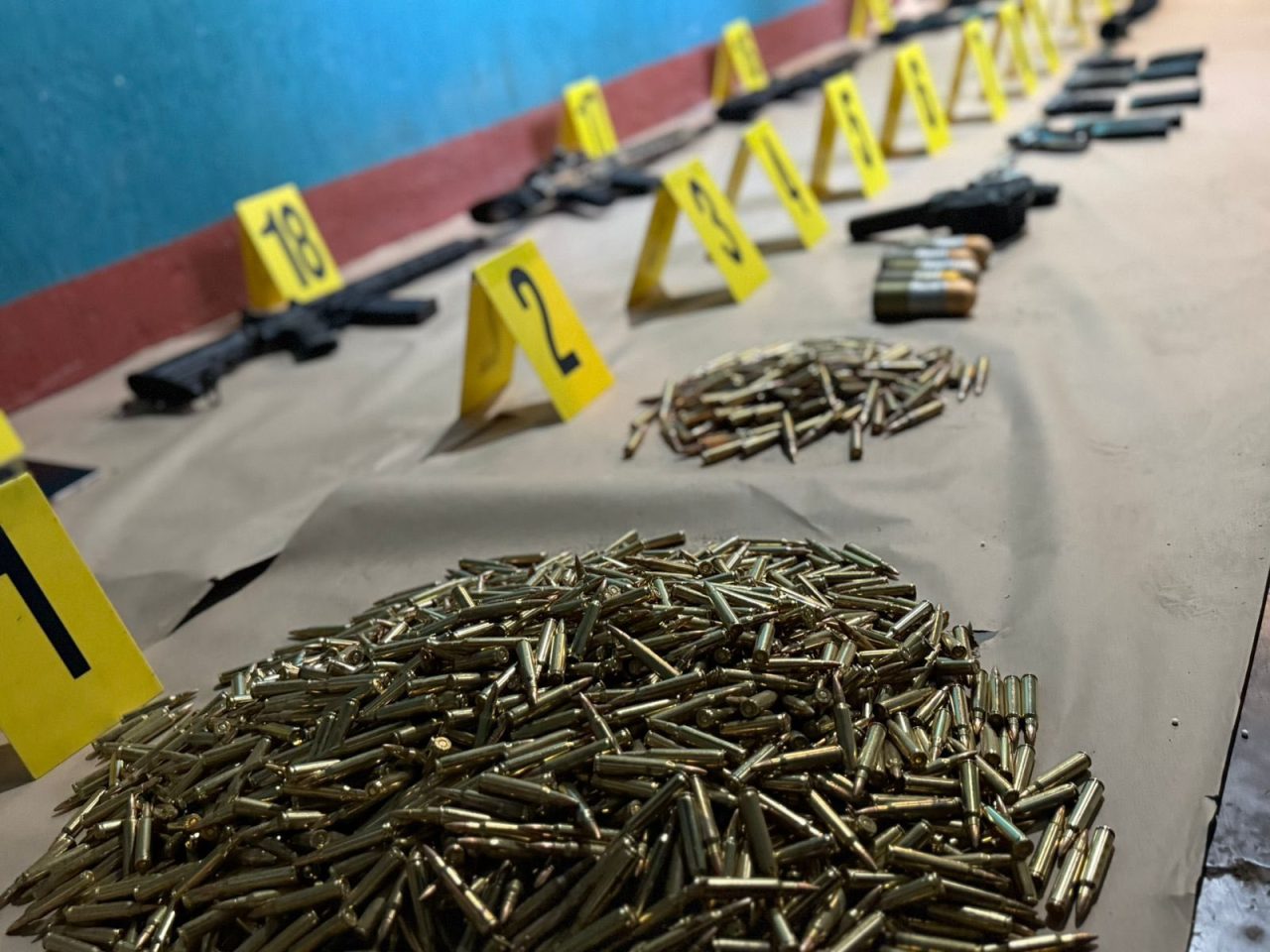 Tras el allanamiento se incauta un arsenal compuesto por un lanzagranadas, cinco fusiles de asalto, una subametralladora, cuatro pistolas, un revólver con el registro esmerilado y 1 mil 839 municiones de diferentes calibres.