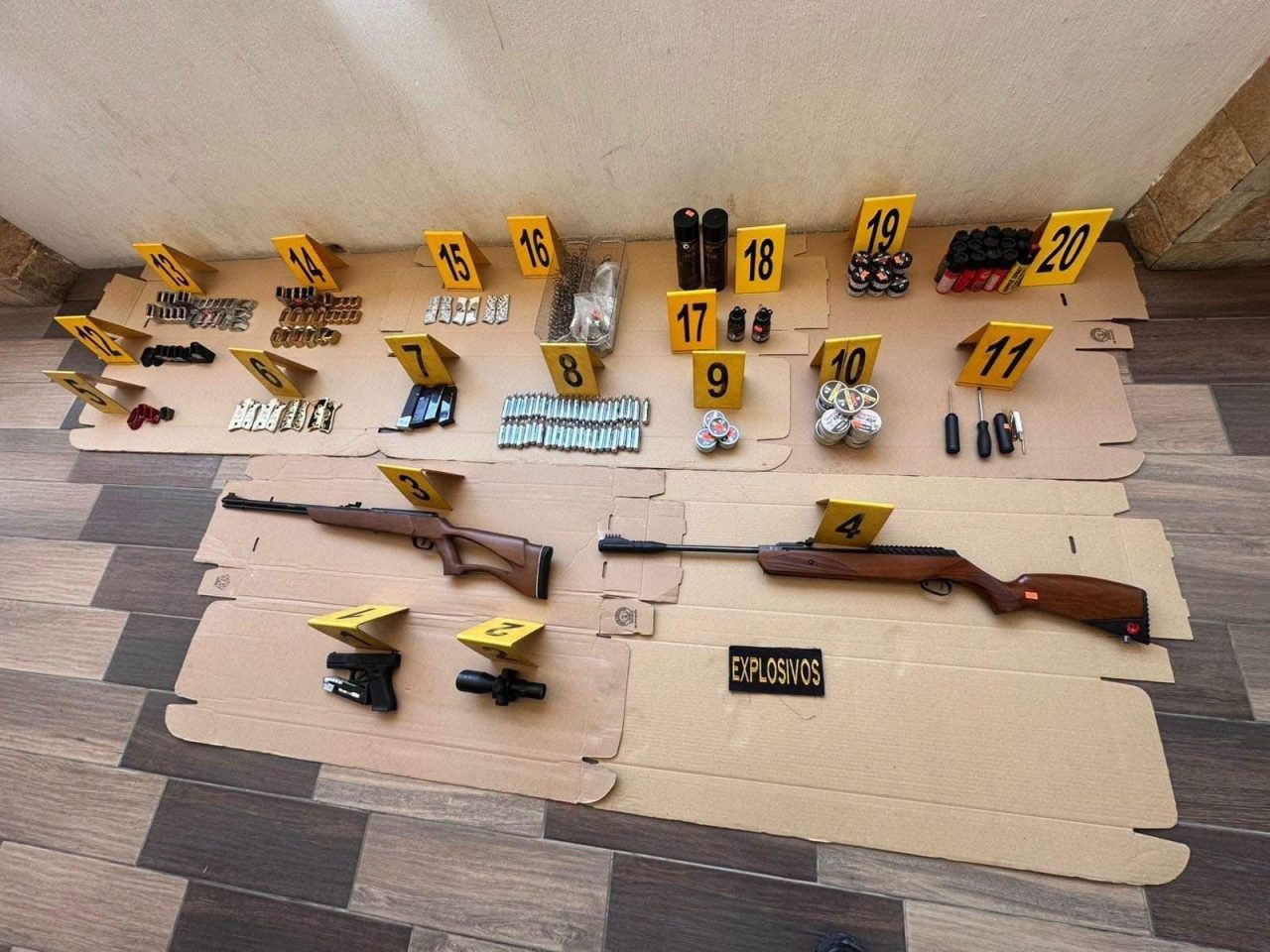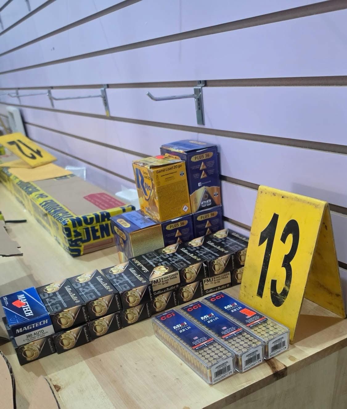 En otro allanamiento realizado por investigadores de la DIDAE en el interior de la plaza Quezada, se secuestró un arma de fuego, 2 rifles de viento, 48 cajas de municiones calibre 9mm, dos cajas de municiones calibre 45 y una caja de balines calibre 22mm.