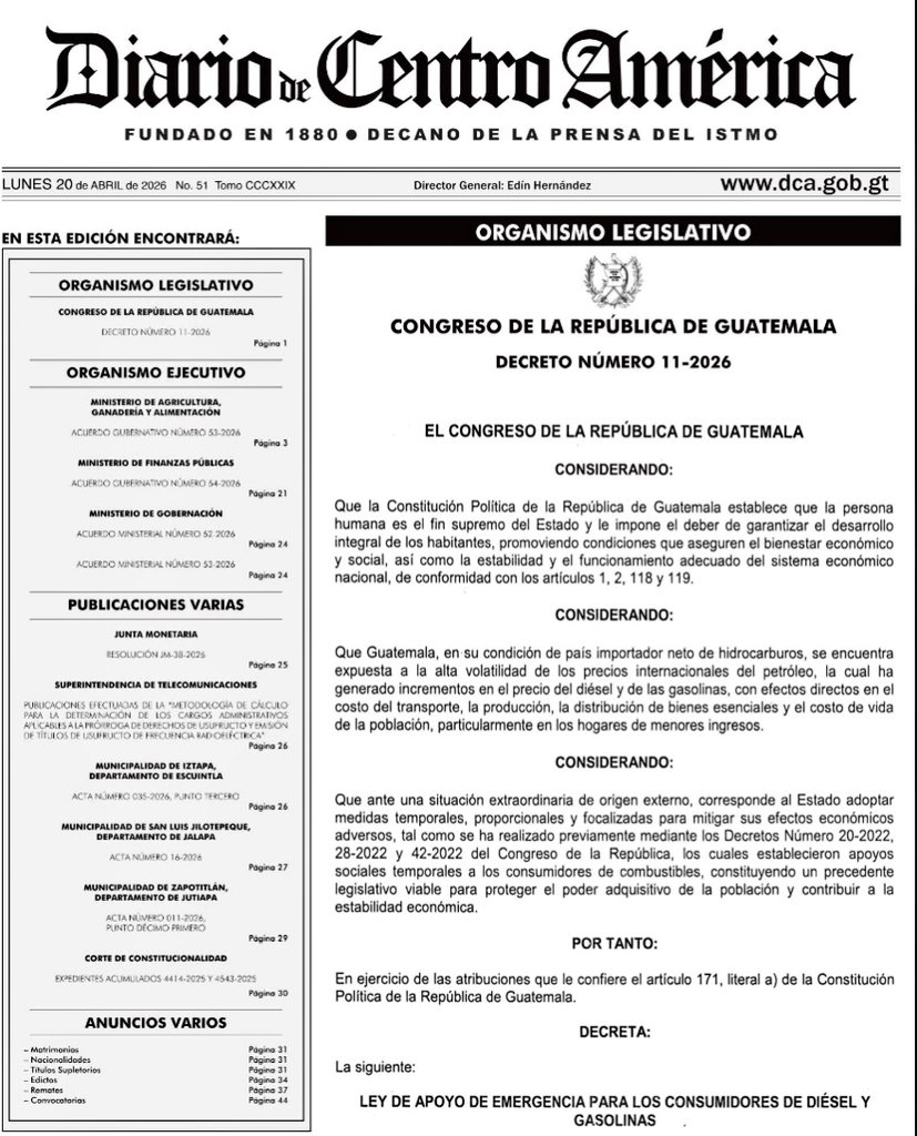 El decreto 11-2026 del Congreso de la República, el cual contiene dicha ley, se publicó este lunes en el Diario de Centro América (oficial), y de acuerdo con el artículo 12 de esta, cobrará vigencia al día siguiente de su publicación.
