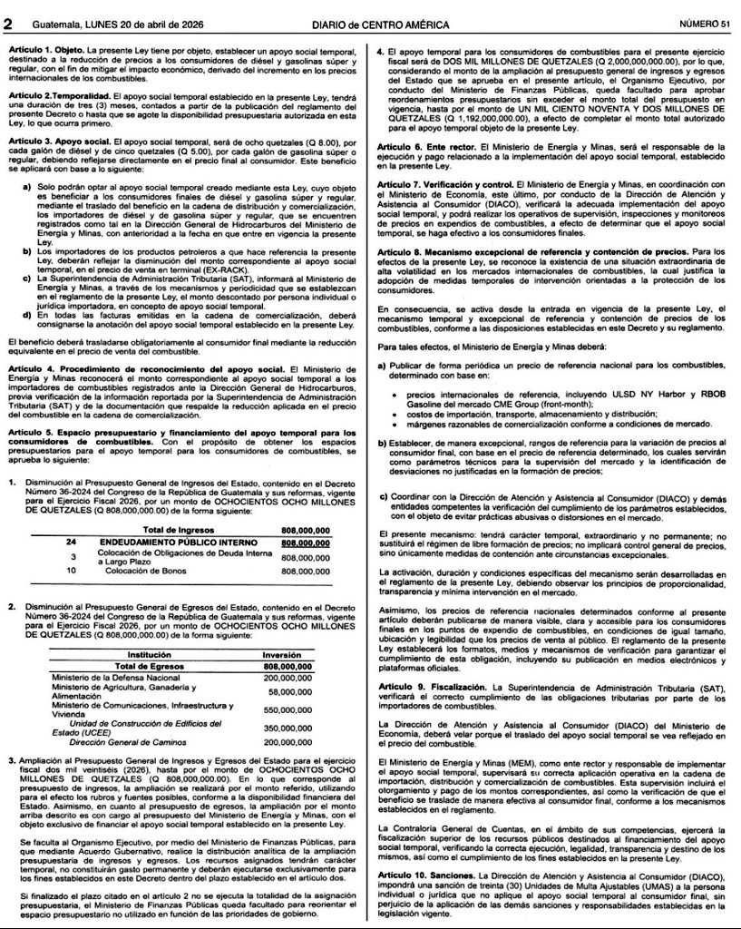 De acuerdo con información del Ministerio de Finanzas, el subsidio se reconocerá a los importadores de combustibles debidamente registrados ante la Dirección General de Hidrocarburos del Ministerio de Energía y Minas, previa verificación por parte de la Superintendencia de Administración Tributaria, la cual validará la correcta aplicación de la reducción en los precios a lo largo de la cadena de comercialización.