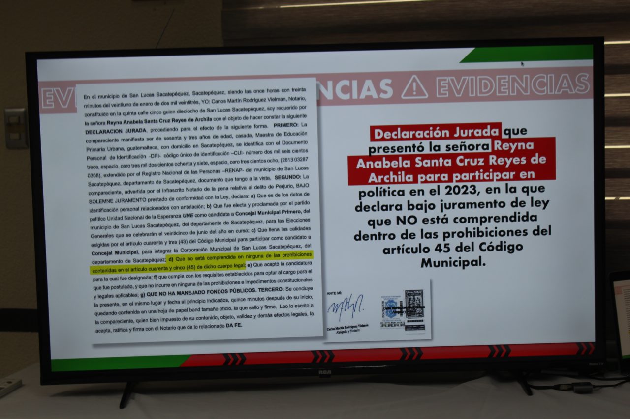 Por posible usurpación de funciones, prolongaciones de funciones públicas, enriquecimiento ilícito, concusión, fraude, cobro indebido, acusación y denuncias falsas y perjurio, la administración municipal de San Lucas Sacatepéquez, presentó una demanda ante el Ministerio Público, en contra de la ex concejal primero Reina Anabela Santa Cruz Reyes de Archila, quien durante el período del ex alcalde Jorge Adán Rodríguez, ejecuto proyectos de más de Q42 millones con empresas vinculadas a ella.