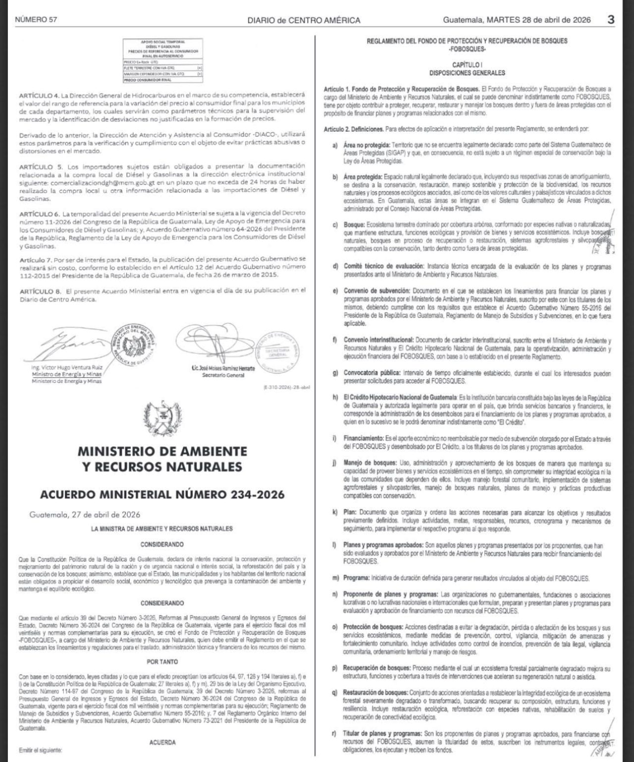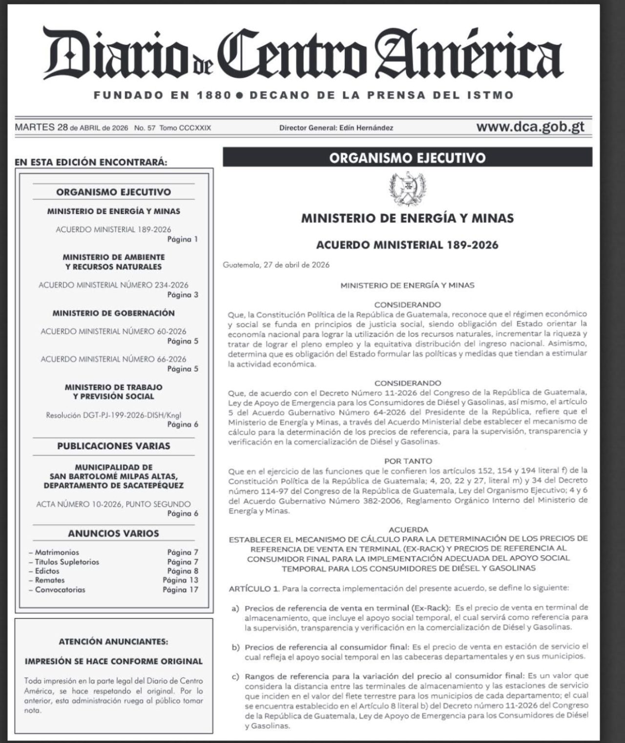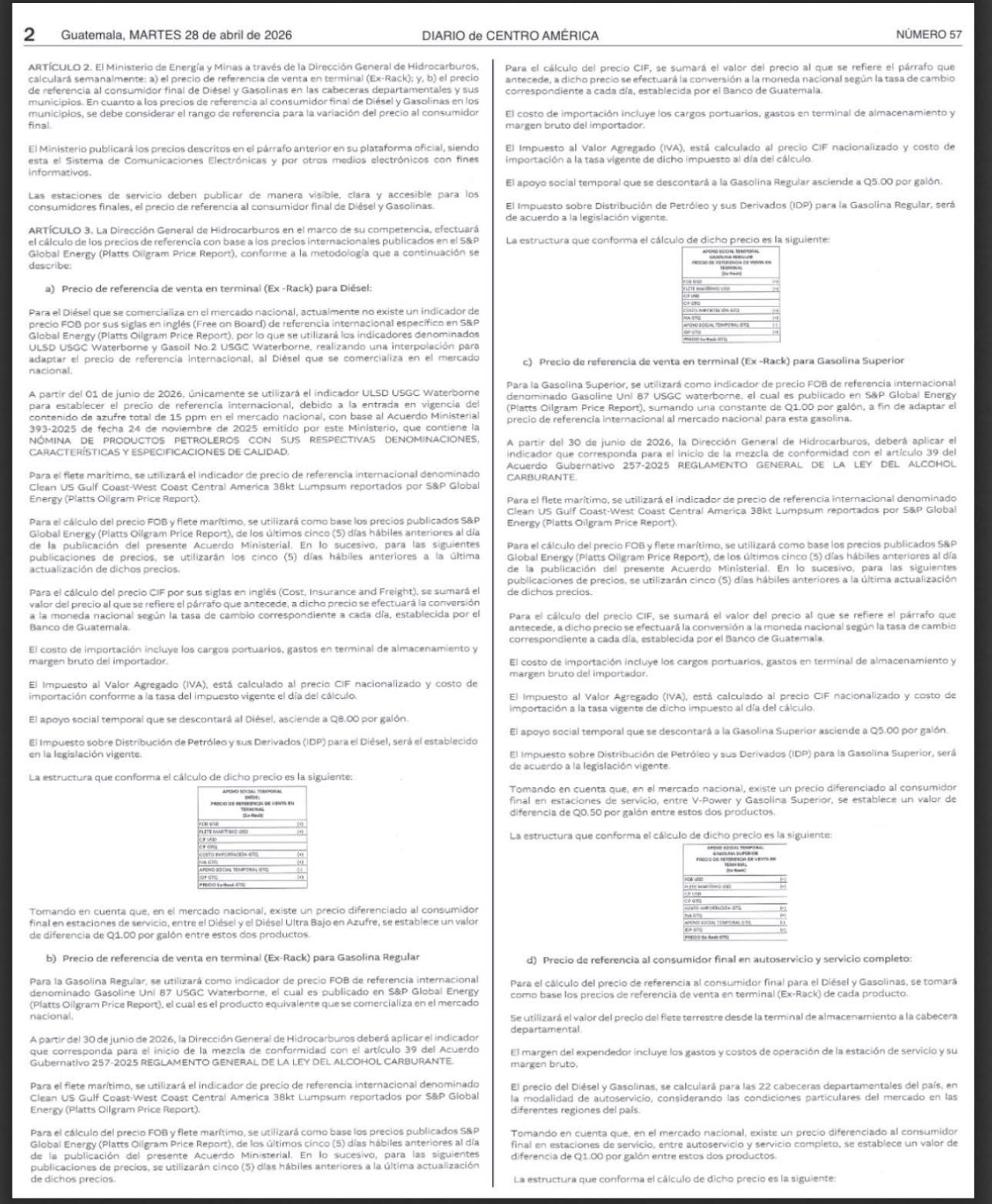 La medida cobra vigencia luego de se publicó en el Diario de Centro América el acuerdo ministerial número 189-2026, por medio del cual también se establecen los precios de referencia para la presente semana.